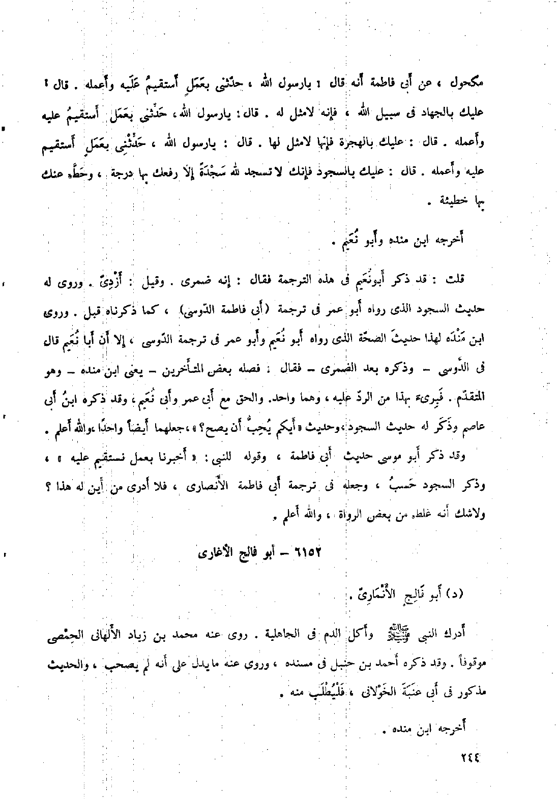 وقد ذكر أبو موسى حديث أبى فاطمة، وقوله للنّبيّ: «أخبرنا بعمل نستقيم عليه» ، وذكر السجود حسب، وجعله في ترجمة أبي فاطمة الأنصاري، فلا أدري من أين له هذا؟