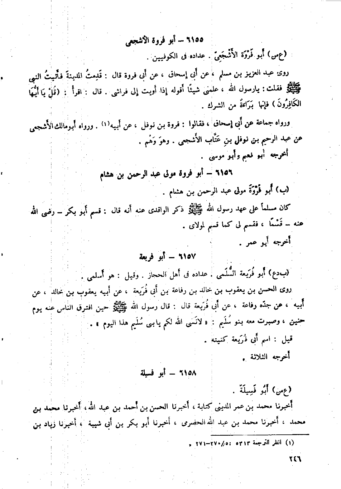 روى عَبْدُ الْعَزِيزِ بْنُ مُسْلِمٍ، عَنْ أَبِي إِسْحَاقَ، عن أبي فروة قال: قدمت المدينة فَأَتَيْتُ النَّبِيَّ صَلَّى اللَّهُ عَلَيْهِ وَسَلَّمَ فَقُلْتُ: يا رسول الله، علمني شيئا أقوله إِذَا أَوَيْتُ إِلَى فِرَاشِي. قَالَ: اقْرَأْ: قُلْ يا أَيُّهَا الْكافِرُونَ ١٠٩: ١ فإنها براءة من الشرك.
