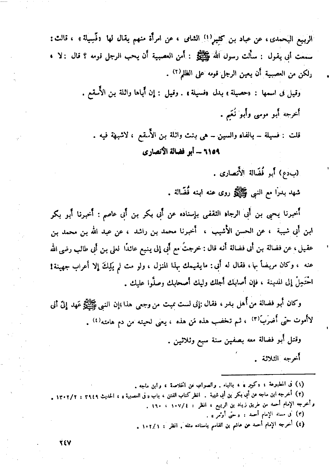 سمعت أبي يقول: سألت رسول الله صلى الله عليه وسلم: أمن العصبية أن يحب الرجل قومه؟ قال: لا، ولكن من العصبية أن يعين الرجل قومه على الظلم [٢] . وقيل في اسمها: «حصيلة» بدل «فسيلة» . وقيل: إن أباها واثلة بن الأسقع.