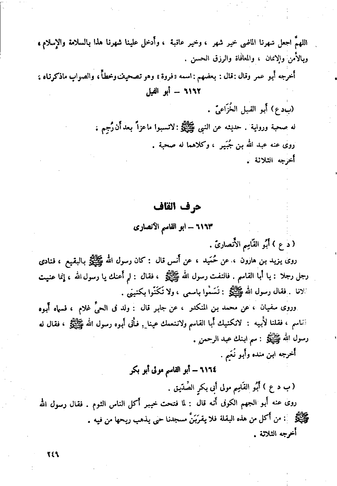 روى يزيد بن هارون، عن حميد، عن أنس قال: كان رسول الله صلى الله عليه وسلم بالبقيع، فنادى رجل رجلا: يا أبا القاسم. فالتفت رسول الله صلى الله عليه وسلم، فقال: لم أعنك يا رسول الله، إنما عنيت فلانا. فقال رَسُول اللَّهِ صَلَّى اللَّهُ عَلَيْهِ وسلم: تسموا باسمي، ولا تكنوا بكنيتي. وروى سفيان، عن محمد بن المنكدر، عن جابر قال: ولد في الحي غلام، فسماه أبوه القاسم، فقلنا لأبيه: لا نكنيك أبا القاسم ولا ننعمك عينا. فأتى أبوه رسول الله صلى الله عليه وسلم، فقال له رسول الله صلى الله عليه وسلم: سم ابنك عَبْد الرَّحْمَن. أَخْرَجَهُ ابْنُ منده وأبو نعيم.