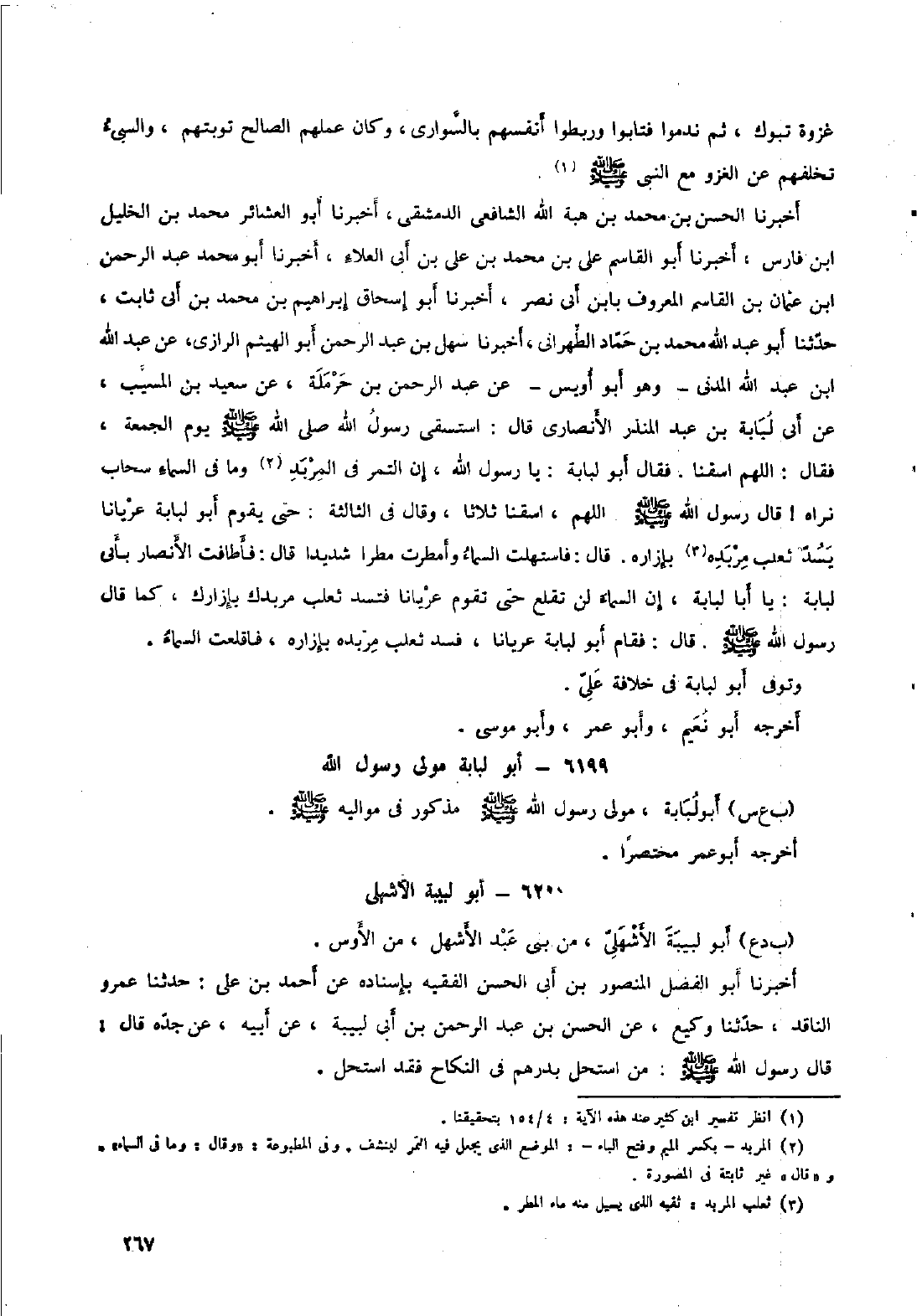 أَخْبَرَنَا الْحَسَنُ بْنُ مُحَمَّدِ بْنِ هِبَةِ اللَّهِ الشَّافِعِيُّ الدِّمَشْقِيُّ، أَخْبَرَنَا أَبُو الْعَشَائِرِ مُحَمَّدُ بْنُ الْخَلِيلِ ابن فارس، أَخْبَرَنَا أَبُو الْقَاسِمِ عَلِيُّ بْنُ مُحَمَّدِ بْنِ عَلِيِّ بْنِ أَبِي الْعَلاءِ، أَخْبَرَنَا أَبُو مُحَمَّدٍ عبد الرحمن ابن عثمان بن القاسم المعروف بابن أَبِي نَصْرٍ، أَخْبَرَنَا أَبُو إِسْحَاقَ إِبْرَاهِيمُ بْنُ محمد بن أبي ثابت، حدثنا أبو عبد الله محمد بن حماد الطهراني، أَخْبَرَنَا سَهْلُ بْنُ عَبْدِ الرَّحْمَنِ أَبُو الْهَيْثَمِ الرازي، عن عبد الله ابن عبد الله المدني- وهو أبو أويس- عَنْ عَبْدِ الرَّحْمَنِ بْنِ حَرْمَلَةَ، عَنْ سَعِيدِ بن المسيب، عن أبي لبابة بن عبد المنذر الأنصاري قَالَ: اسْتَسْقَى رَسُولُ اللَّهِ صَلَّى اللَّهُ عَلَيْهِ وسلم يوم الجمعة، فقال: اللَّهمّ اسقنا. فقال أبو لبابة: يا رسول الله، إِنَّ التَّمْرَ فِي الْمِرْبَدِ [٢] وَمَا فِي السَّمَاءِ سحاب نراه! قال رسول الله صلى الله عليه وسلم اللَّهمّ، اسقنا ثلاثا، وقال فِي الثَّالِثَةِ: حَتَّى يَقُومَ أَبُو لُبَابَةَ عُرْيَانًا يسد ثعلب مربده [٣] بإزاره. قال: فاستهلت السماء وأمطرت مطرا شديدا قال: فأطافت الأنصار بأبي لبابة: يَا أَبَا لُبَابَةَ، إِنَّ السَّمَاءَ لَنْ تُقْلِعَ حتى تقوم عريانا فتسد ثَعْلَبَ مِرْبَدِكَ بِإِزَارِكَ، كَمَا قَالَ رَسُولُ اللَّهِ صَلَّى اللَّهُ عَلَيْهِ وسلم. قال: فَقَامَ أَبُو لُبَابَةَ عُرْيَانًا، فَسَدَّ ثَعْلَبَ مِرْبَدِهِ بإزاره، فأقلعت السماء.
