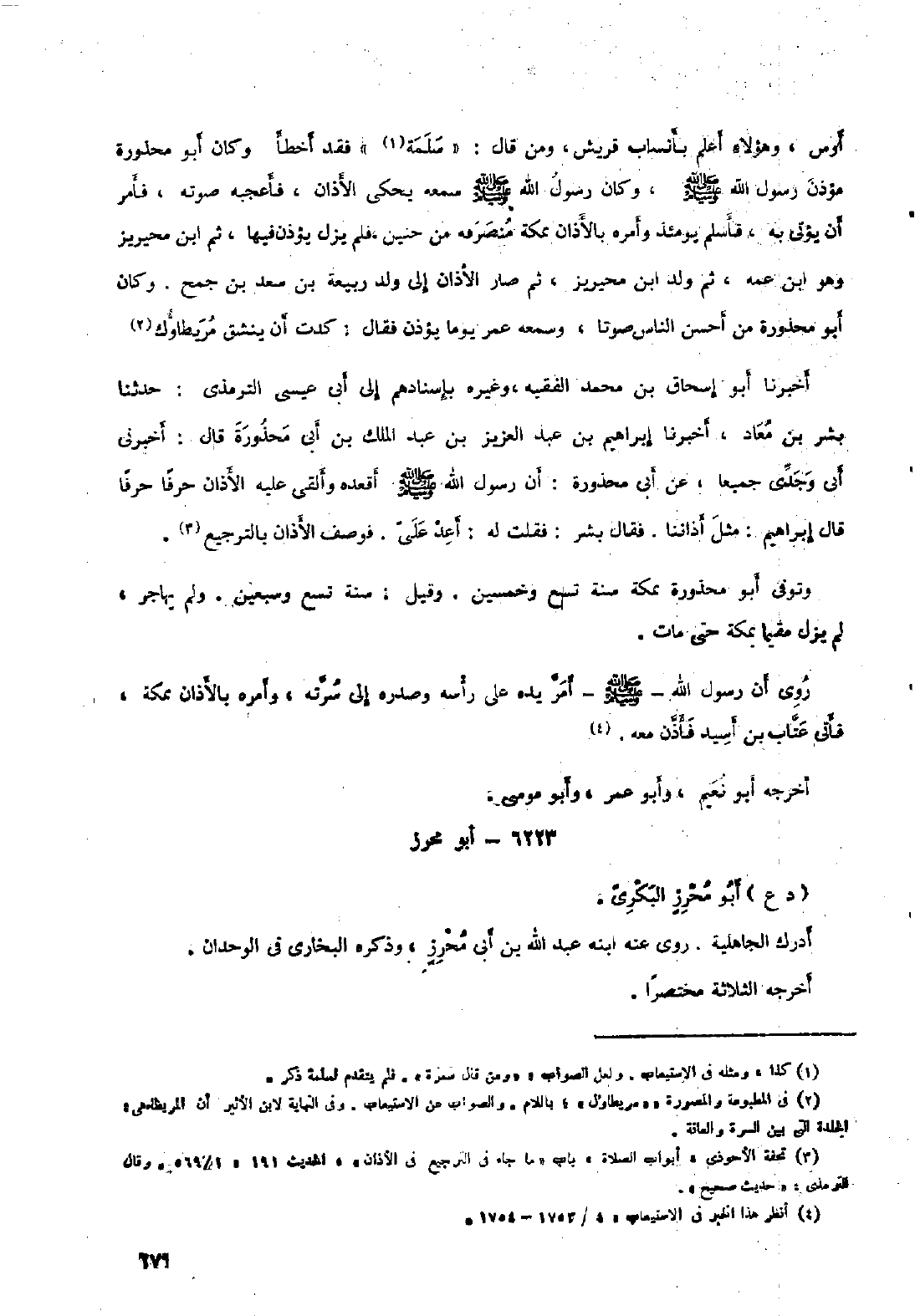 أوس، وهؤلاء أعلم بأنساب قريش، ومن قال: «سلمة [١] » فقد أخطأ وكان أبو محذورة مؤذن رَسُول اللَّهِ صَلَّى اللَّهُ عَلَيْهِ وَسَلَّمَ، وكان رسول الله صلى الله عليه وسلم سمعه يحكي الأذان، فأعجبه صوته، فأمر أن يؤتى به، فأسلم يومئذ وأمره بالأذان بمكة منصرفه من حنين، فلم يزل يؤذن فيها، ثم ابن محيريز وهو ابن عمه، ثم ولد ابن محيريز، ثم صار الأذان إلى ولد ربيعة بن سعد بن جمح. وكان أبو محذورة من أحسن الناس صوتا، وسمعه عمر يوما يؤذن فقال: كدت أن ينشق مريطاؤك [٢] أخبرنا أبو إسحاق بن محمد الفقيه، وَغَيْرُهُ بِإِسْنَادِهِمْ إِلَى أَبِي عِيسَى التِّرْمِذِيُّ: حَدَّثَنَا بشر بن معاد، أَخْبَرَنَا إِبْرَاهِيمُ بْنُ عَبْدِ الْعَزِيزِ بْنِ عَبْدِ الْمَلِكِ بْنِ أَبِي مَحْذُورَةَ قَالَ: أَخْبَرَنِي أَبِي وَجَدِّي جَمِيعًا، عَنْ أَبِي مَحْذُورَةَ: أَنَّ رَسُول اللَّهِ صَلَّى اللَّهُ عَلَيْهِ وَسَلَّمَ أَقْعَدَهُ وَأَلْقَى عَلَيْهِ الأَذَانَ حَرْفًا حَرْفًا قال إِبْرَاهِيم: مثل أذاننا. فقال بشر: فقلت له: أعد علي. فوصف الأذان بالترجيع [٣] .
