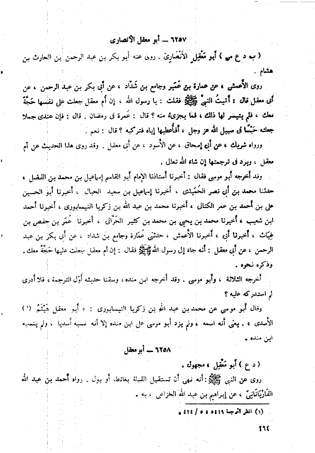 وقد أخرجه أبو موسى فقال: أخبرنا أستاذنا الإمام أَبُو الْقَاسِمِ إِسْمَاعِيل بْنُ مُحَمَّدِ بْنِ الْفَضْلِ، حدثنا محمد بن أبي نصر الحميدي، أخبرنا إسماعيل بن سعيد الحبال، أخبرنا أبو الحسين علي بن أحمد بن عمر الكناني، أخبرنا محمد بن عبد الله بن زكريا النيسابورىّ، أخبرنا أحمد ابن شعيب، أخبرنا محمد بن يحيى بن محمد بن كثير الحراني، أخبرنا عمر بن حفص بن غياث، أخبرنا أبي، أخبرنا الأعمش، حدثني عمارة وجامع بن شداد، عن أبي بكر بن عبد الرحمن، عن أبي معقل: أَنَّهُ جَاءَ إِلَى رَسُولِ اللَّهِ صَلَّى اللَّهُ عَلَيْهِ وسلم فقال: إن أم معقل جعلت عليها حجة معك.