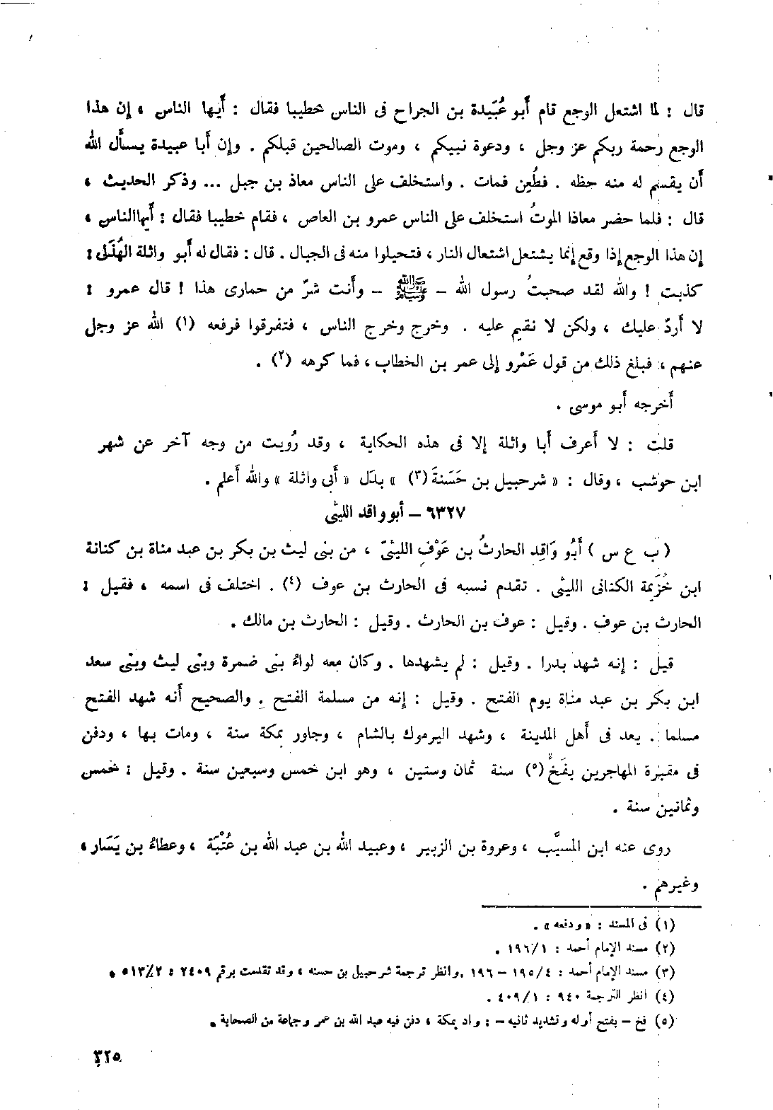 قَالَ: لما اشتعل الوجع قام أَبُو عبيدة بن الجراح في الناس خطيبا فَقَالَ: أيها النَّاس، إن هَذَا الوجع رحمة ربكم عز وجل، ودعوة نبيكم، وموت الصالحين قبلكم. وإن أبا عبيدة يسأل اللَّه أن يقسم لَهُ مِنْهُ حظه. فطعن فمات. واستخلف عَلَى النَّاس مُعَاذِ بْن جبل ... وذكر الحديث، قال: فلما حضر معاذاً الموت استخلف على الناس عمرو بن العاص، فقام خطيبا فَقَالَ: أيها النَّاس، إن هَذَا الوجع إذا وقع إنما يشتعل اشتعال النار، فتحيلوا منه في الجبال. قال: فقال له أبو واثلة الهذلي: