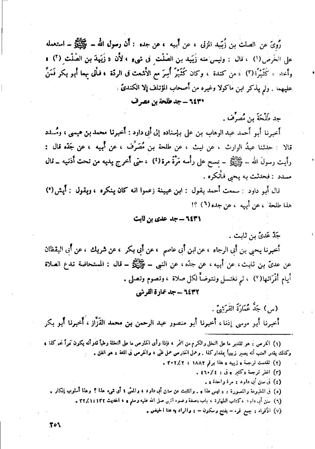 أخبرنا أبو أحمد عبد الوهاب بن علي بإسناده إلى أبي داود: أخبرنا محمد بن عيسى، ومسدد قالا: حدثنا عبد الوارث، عن ليث، عَنْ طَلْحَةَ بْنِ مُصَرِّفٍ، عَنْ أَبِيهِ، عَنْ جَدِّهِ قَالَ:
