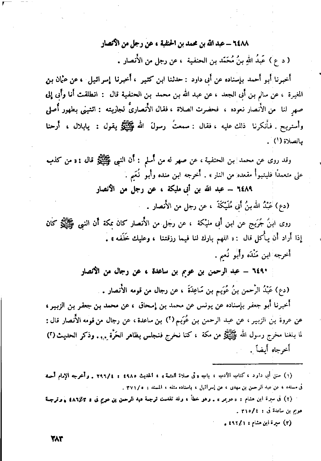 أخبرنا أبو أحمد بإسناده عن أبي داود: حدثنا ابن كثير، أخبرنا إسرائيل، عن عثمان بن المغيرة، عَنْ سَالِمِ بْنِ أَبِي الْجَعْدِ، عَنْ عَبْد اللَّهِ بْن مُحَمَّدِ بْنِ الحنفية قال: انطلقت أنا وأبي إلى صهر لنا من الأنصار نعوده، فحضرت الصلاة، فقال الأنصاري لجاريته: ائتيني بطهور أصلي وأستريح. فأنكرنا ذلك عليه، فقال: سمعت رسول الله صلى الله عليه وسلم يقول: يا بلال، أرحنا بالصلاة [١] . وقد روى عن محمد بن الحنفية، عن صهر له من أسلم: أن النبي صلى الله عليه وسلم قال: «من كذب علي متعمدا فليتبوَّأ مقعده من النار» . أخرجه ابن منده وأبو نعيم.