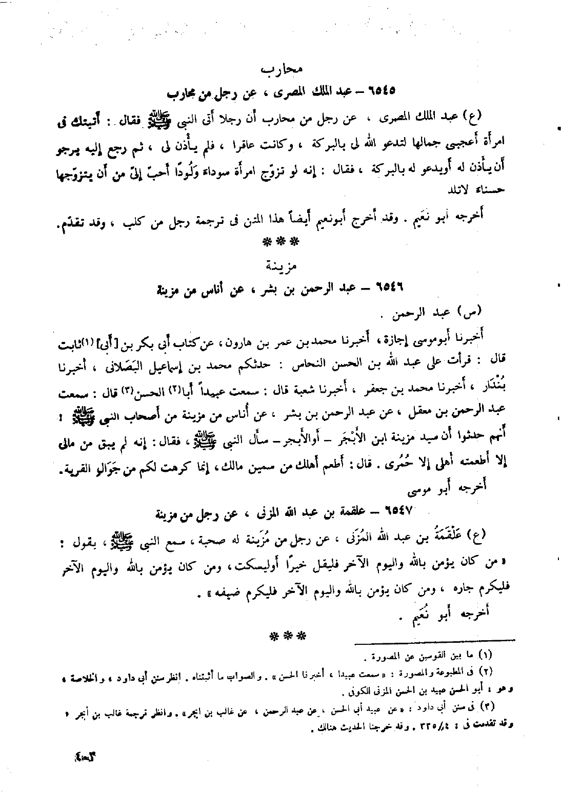 (ع) عبد الملك المصري، عن رجل من محارب أن رجلا أتى النَّبِيّ صَلَّى اللَّهُ عَلَيْهِ وسلم فقال: أتيتك في امرأة أعجبني جمالها لتدعو الله لي بالبركة، وكانت عاقرا، فلم يأذن لي، ثم رجع إليه يرجو أن يأذن له أو يدعو له بالبركة، فقال: إنه لو تزوج امرأة سوداء ولودا أحب إلي من أن يتزوجها حسناء لا تلد. أخرجه أبو نعيم. وقد أخرج أبو نعيم أيضا هذا المتن في ترجمة رجل من كلب، وقد تقدّم.