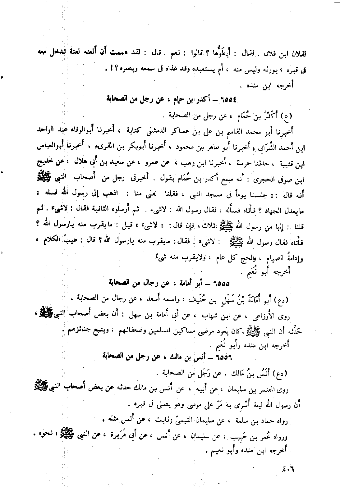 أَخْبَرَنَا أَبُو مُحَمَّدٍ الْقَاسِمُ بْنُ عَلِيِّ بْنِ عساكر الدمشقي كتابة، أخبرنا أبو الوفاء عبد الواحد ابن أحمد الشرابي، أخبرنا أبو طاهر بن محمود، أَخْبَرَنَا أَبُو بَكْرِ بْنُ الْمُقْرِئِ، أَخْبَرَنَا أَبُو العباس ابن قتيبة، حدثنا حرملة، أخبرنا ابن وهب، عن عمرو، عن سعيد بن أبي هلال، عن خديج ابن صوفي الحجري: أنه سمع أكدر بن حمام يقول: أخبرني رجل من أصحاب النبي صلى الله عليه وسلم أنه قال: «جلسنا يوما في مسجد النبي، فقلنا لفتى منا: اذهب إلى رسول الله فسله: