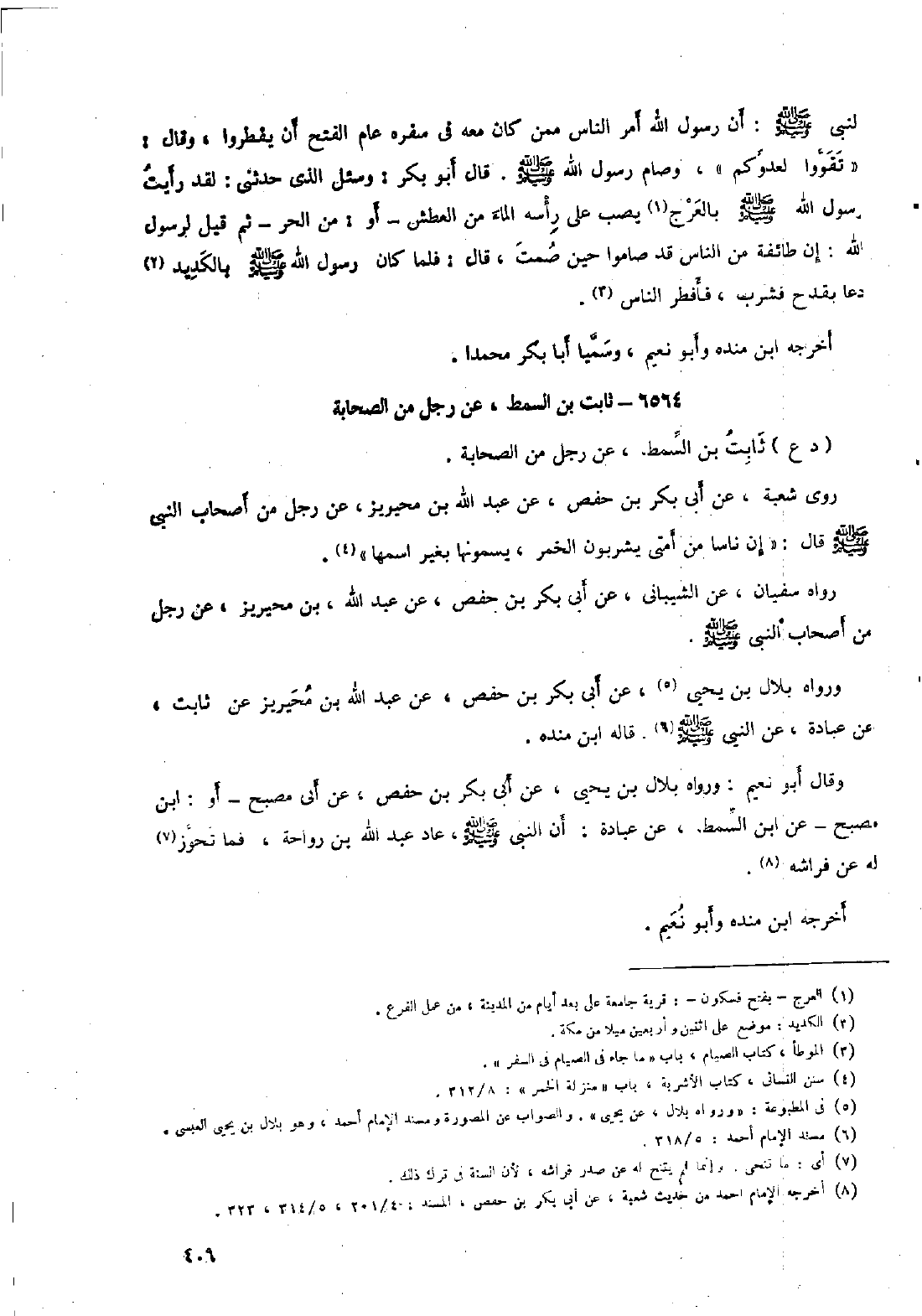 ورواه بلال بن يحيى [٥] ، عن أبي بكر بن حفص، عن عبد الله بن محيريز عن ثابت، عن عبادة، عَنِ النَّبِيّ صَلَّى اللَّهُ عَلَيْهِ وَسَلَّمَ [٦] . قاله ابن منده. وقال أبو نعيم: ورواه بلال بن يحيى، عن أبي بكر بن حفص، عن أبي مصبح- أو: ابن مصبح- عن ابن السمط، عن عبادة: أن النَّبِيّ صَلَّى اللَّهُ عَلَيْهِ وَسَلَّمَ، عاد عبد الله بن رواحة، فما تحوز [٧] له عن فراشة [٨] .