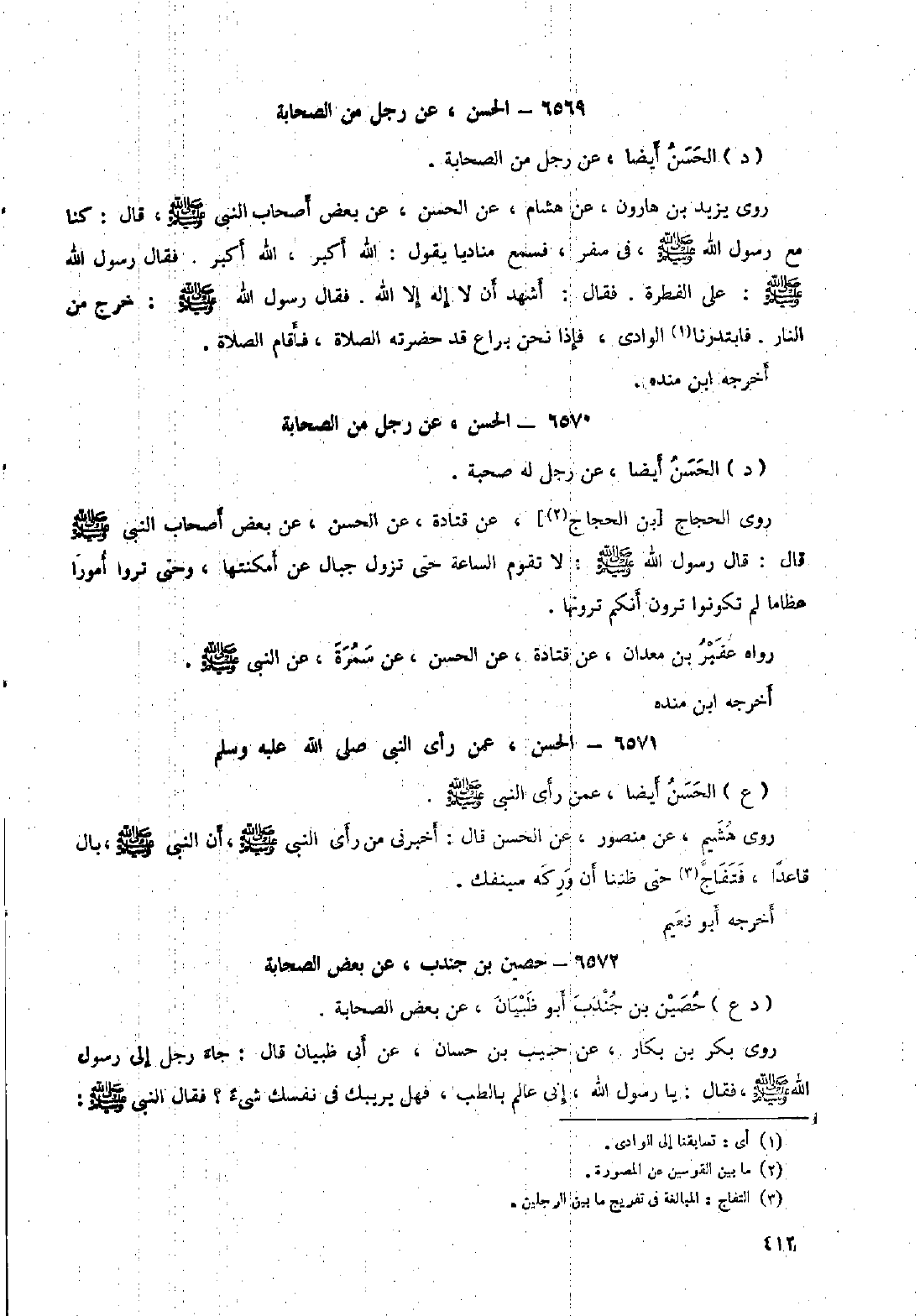 روى يزيد بن هارون، عن هشام، عن الحسن، عن بعض أصحاب النَّبِيّ صَلَّى اللَّهُ عَلَيْهِ وَسَلَّمَ، قال: كنا مع رسول الله صلى الله عليه وسلم، في سفر، فسمع مناديا يقول: الله أكبر، الله أكبر. فقال رسول الله صلى الله عليه وسلم: على الفطرة. فقال: أشهد أن لا إله إلا اللَّه. فقال رسول الله صلى الله عليه وسلم: خرج من النار. فابتدرنا [١] الوادي، فإذا نحن براع قد حضرته الصلاة، فأقام الصلاة. أخرجه ابن مندة.