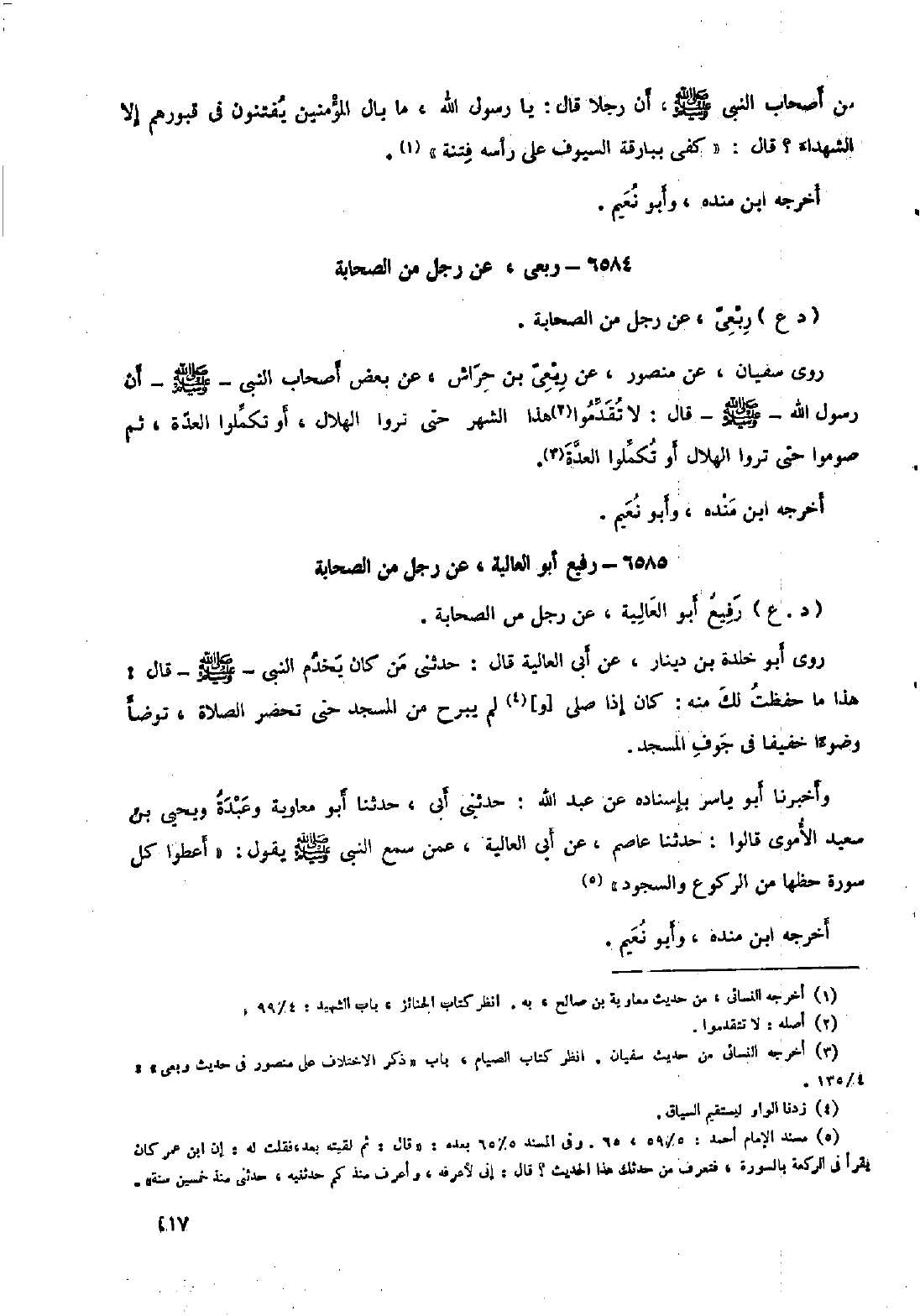 روى سفيان، عن منصور، عن ربعي بن حراش، عن بعض أصحاب النَّبِيّ- صَلَّى اللَّهُ عَلَيْهِ وَسَلَّمَ- أن رسول الله- صلى الله عليه وسلم- قال: لا تقدموا [٢] هذا الشهر حتى تروا الهلال، أو تكملوا العدة، ثم صوموا حتى تروا الهلال أو تكملوا العدة [٣] . أخرجه ابن مندة، وأبو نعيم.