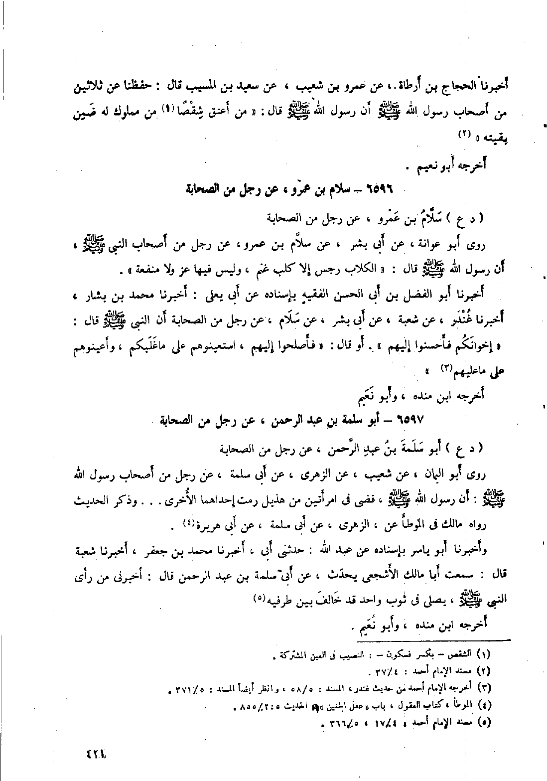 روى أَبُو عوانة، عَنْ أَبِي بشر، عَنْ سلام بْن عمرو، عَنْ رجل من أصحاب النَّبِيّ صَلَّى اللَّهُ عَلَيْهِ وَسَلَّمَ، أَنَّ رَسُولَ اللَّهِ صَلَّى اللَّهُ عليه وسلم قال: «الكلاب رجس إلا كلب غنم، وليس فيها عز ولا منفعة» . أَخْبَرَنَا أَبُو الْفَضْلِ بْنُ أَبِي الْحَسَنِ الْفَقِيهُ بإسناده عن أبي يعلى: أخبرنا محمد بن بشار، أخبرنا غندر، عن شعبة، عن أبي بشر، عن سلام، عن رجل مِنَ الصَّحَابَةِ أَنَّ النَّبِيَّ صَلَّى اللَّهُ عَلَيْهِ وسلم قال: «إخوانكم فأحسنوا إليهم» . أو قال: «فأصلحوا إليهم، استعينوهم على ما غلبكم، وأعينوهم على ما عليهم [٣] » . أخرجه ابن مندة، وأبو نعيم.