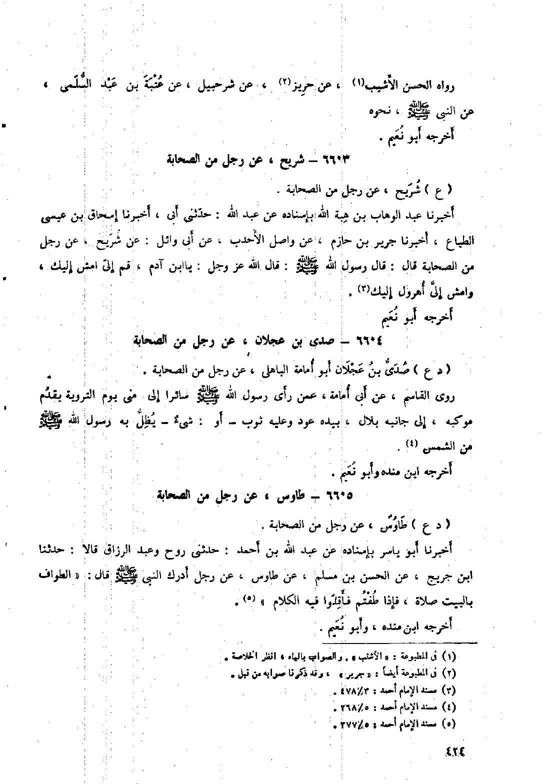 أَخْبَرَنَا أَبُو يَاسِرٍ بِإِسْنَادِهِ عَنْ عَبْدِ اللَّهِ بن أحمد: حدثني روح وعبد الرزاق قالا: حدثنا ابْنِ جُرَيْجٍ، عَنِ الْحَسَنِ بْنِ مُسْلِمٍ، عَنْ طاوس، عن رجل أَدْرَكَ النَّبِيّ صَلَّى اللَّهُ عَلَيْهِ وَسَلَّمَ قَالَ: «الطواف بالبيت صلاة، فإذا طفتم فأقلوا فيه الكلام» [٥] . أخرجه ابن مندة، وأبو نعيم.