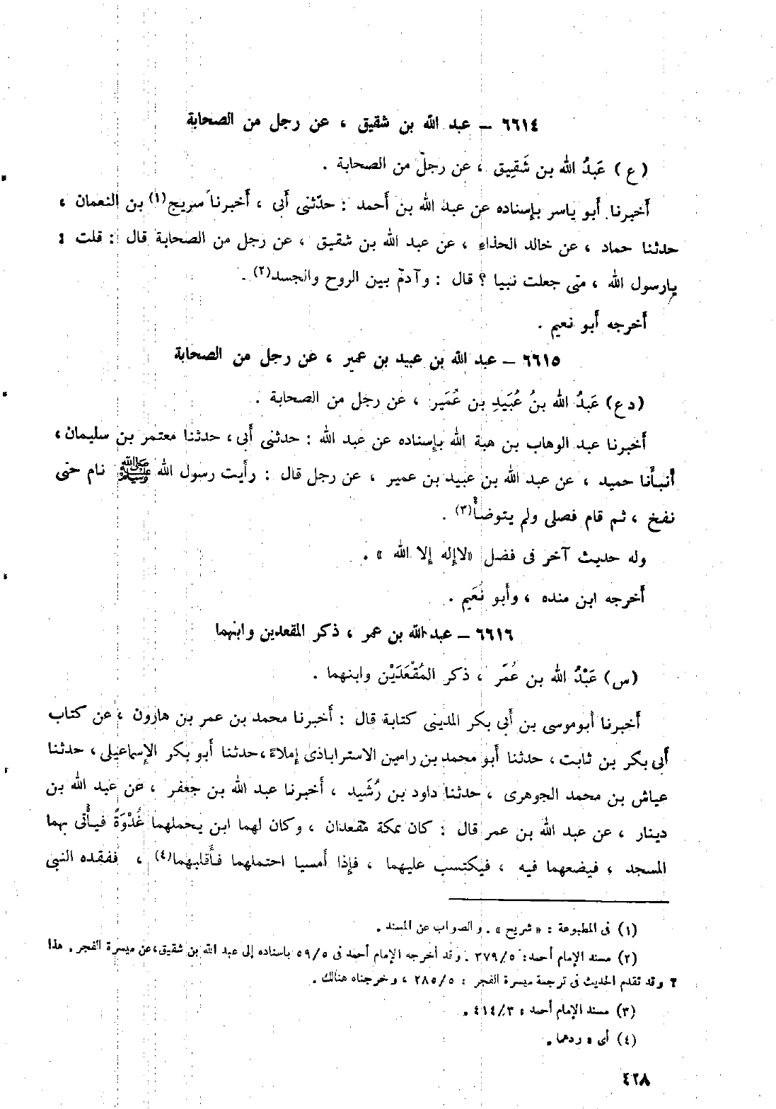 أخبرنا عبد الوهاب بن هبة الله بإسناده عن عبد الله: حدثني أبي، حدثنا معتمر بن سليمان، أنبأنا حميد، عَنْ عَبْد اللَّهِ بْن عبيد بْن عمير، عن رجل قال: رأيت رسول الله صلى الله عليه وسلم نام حتى نفخ، ثم قام فصلى ولم يتوضأ [٣] . وله حديث آخر في فضل «لا إله إلا الله» .