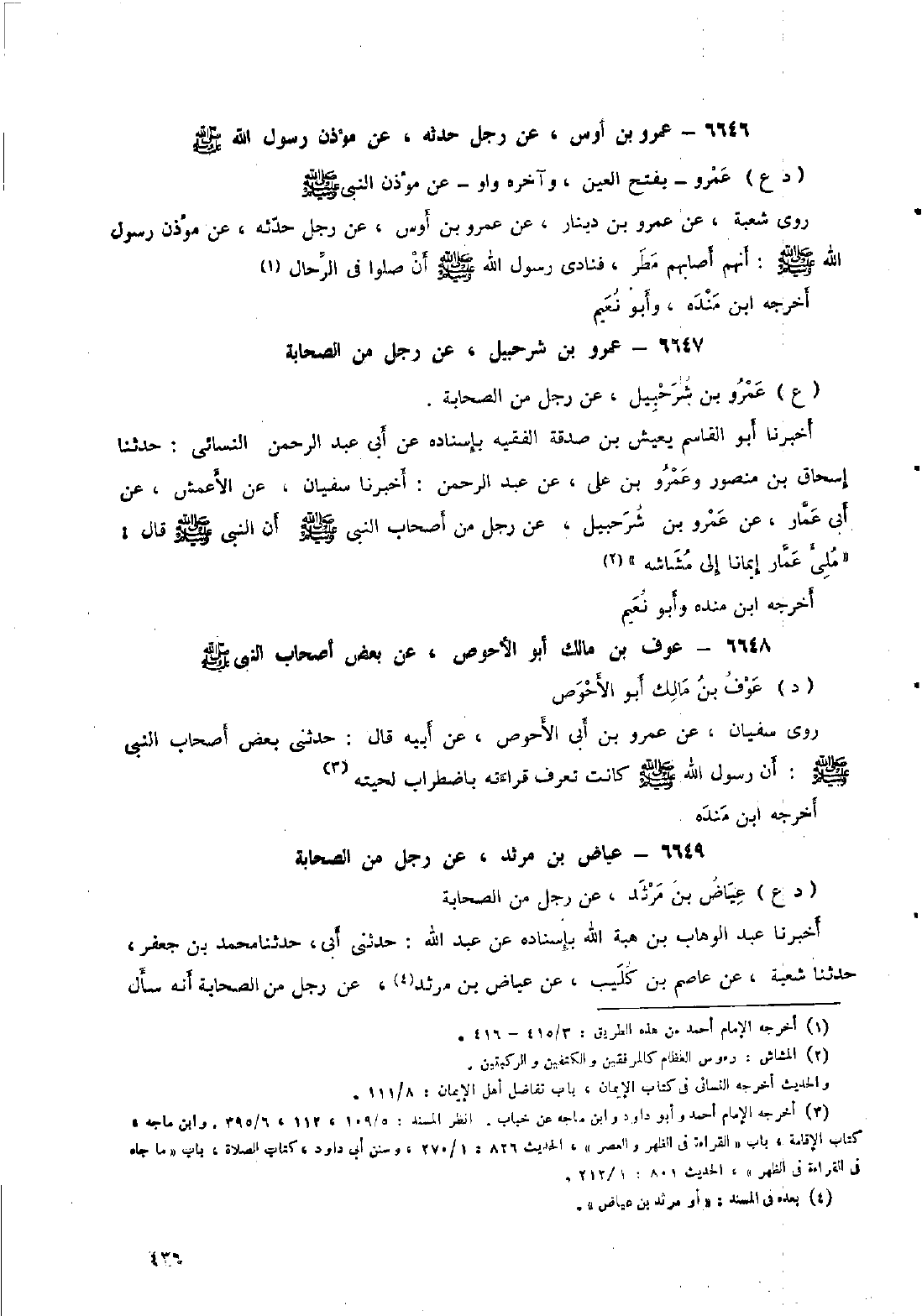أَخْبَرَنَا أَبُو الْقَاسِمِ يَعِيشُ بْنُ صَدَقَةَ الْفَقِيهُ بِإِسْنَادِهِ عَنْ أَبِي عبد الرحمن النسائي: حدثنا إسحاق بن منصور وعمرو بن علي، عن عبد الرحمن: أخبرنا سفيان، عَنِ الْأَعْمَشِ، عَنْ أَبِي عَمَّارٍ، عَنْ عَمْرِو بن شرحبيل، عَنْ رجل من أصحاب النَّبِيّ صَلَّى اللَّهُ عليه وسلم أن النبي صلى الله عليه وسلم قال: «ملئ عمار إيمانا إلى مشاشه» [٢] . أخرجه ابن مندة وأبو نعيم.