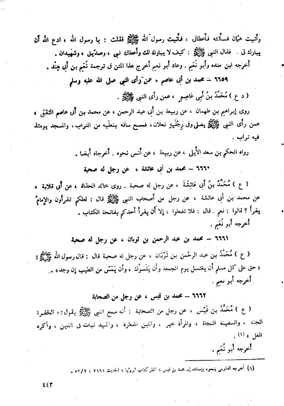 (ع) مُحَمَّدِ بْنِ عَبْدِ الرَّحْمَنِ بْنِ ثَوْبَانَ، عَنْ رجل له صحبة قال: قال رَسُول اللَّهِ صَلَّى الله عليه وسلم: «حق على كل مسلم أن يغتسل يوم الجمعة وأن يتسوك، وأن يمس من الطيب إن وجد» . أخرجه أبو نعيم.