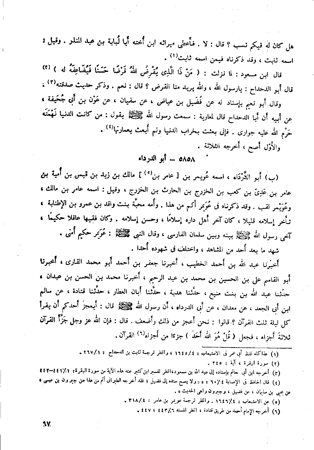 [٥] عن الاستيعاب: ٤/ ١٦٤٦. وانظر ترجمة عويمر بن عامر: ٤/ ٣١٨.