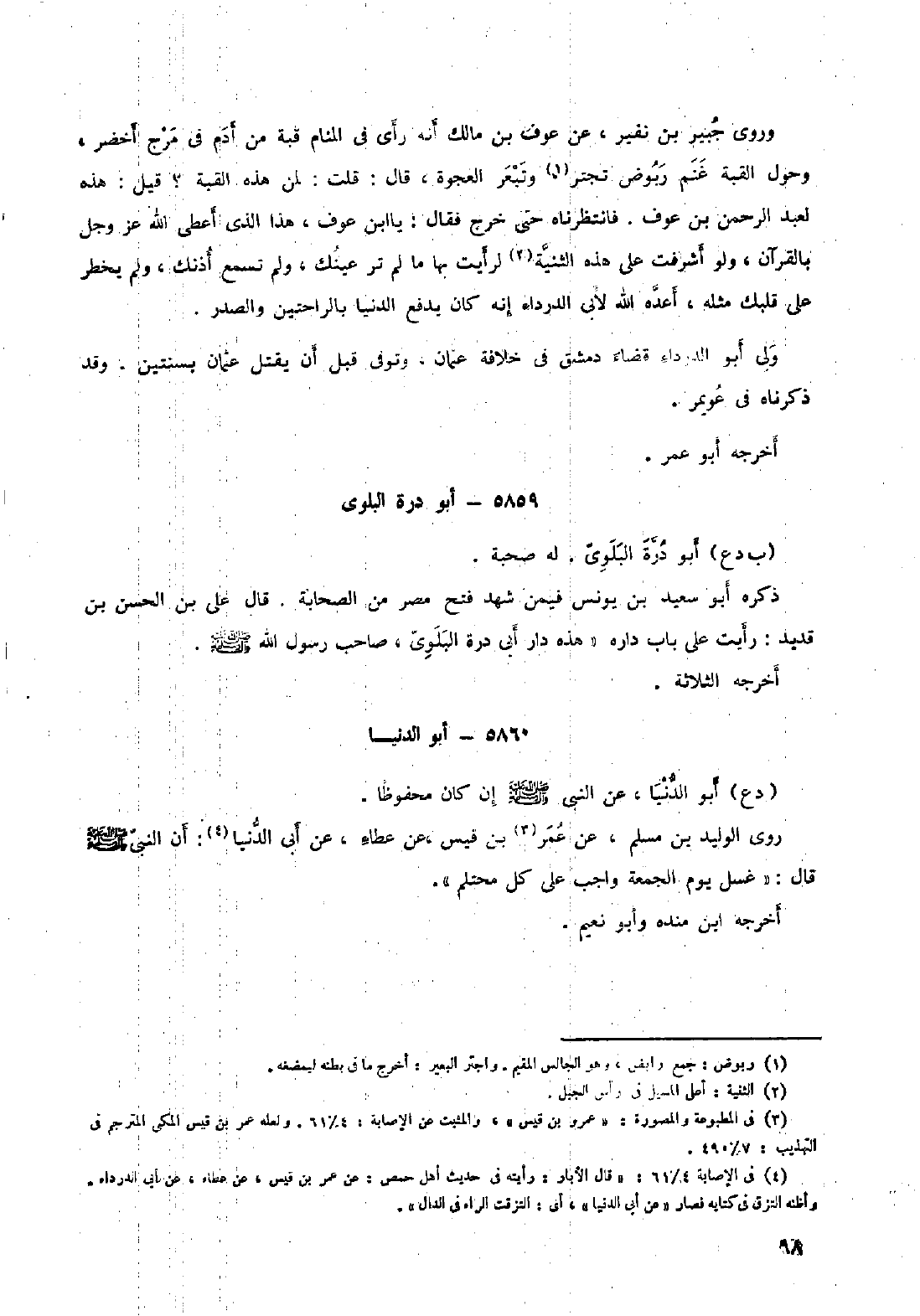 وروى جبير بن نفير، عن عوف بن مالك أَنَّهُ رأى فِي المنام قبة من أدم فِي مرج أخضر، وحول القبة غنم ربوض تجتر [١] وتبعر العجوة، قَالَ: قلت: لمن هَذِه القبة؟ قيل: هَذِه لعبد الرحمن بن عوف. فانتظرناه حَتَّى خرج فقال: يا ابن عوف، هَذَا الَّذِي أعطى الله عَزَّ وَجَلَّ بالقرآن، ولو أشرفت عَلَى هَذِه الثنية [٢] لرأيت بِهَا ما لَمْ تر عينك، ولم تسمع أذنك، ولم يخطر عَلَى قلبك مثله، أعده الله لأبي الدرداء إنه كَانَ يدفع الدُّنْيَا بالراحتين والصدر.