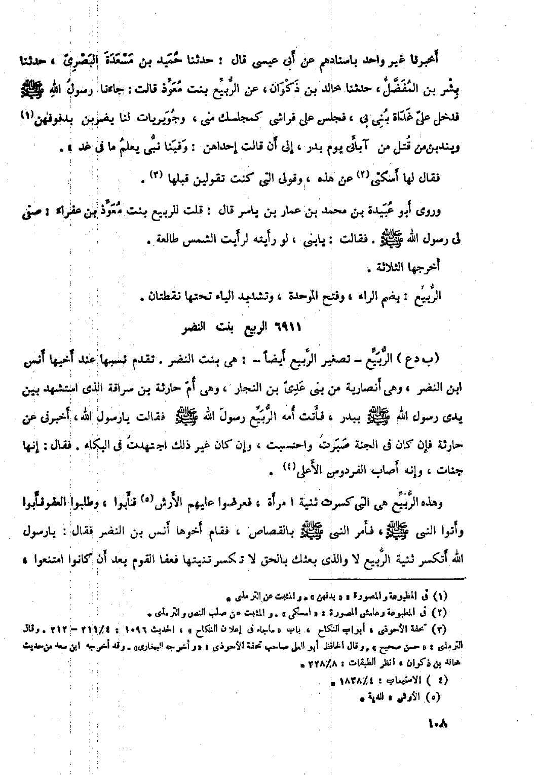 (ب د ع) الربيع- تصغير الربيع أيضا-: هي بنت النضر. تقدم نسبها عند أخيها أنس ابن النضر، وهي أنصارية من بني عدي بن النجار، وهي أم حارثة بن سراقة الذي استشهد بين يدي رسول الله صلى الله عليه وسلم ببدر، فأتت أمة الربيع رسول الله صلى الله عليه وسلم فقالت يا رسول الله، أخبرني عن حارثة فإن كان في الجنة صبرت واحتسبت، وإن كان غير ذلك اجتهدت في البكاء. فقال: إنها جنات، وإنه أصاب الفردوس الأعلى [٤] . وهذه الربيع هي التي كسرت ثنية امرأة، فعرضوا عليهم الأرش [٥] فأبوا، وطلبوا العفو فأبوا وأتوا النَّبِيَّ صَلَّى اللَّهُ عَلَيْهِ وَسَلَّمَ، فَأَمَرَ النَّبِيُّ صلى الله عليه وسلم بالقصاص، فقام أخوها أنس بن النضر فقال: يا رسول الله أتكسر ثنية الربيع لا والذي بعثك بالحق لا تكسر ثنيتها فعفا القوم بعد أن كانوا امتنعوا،