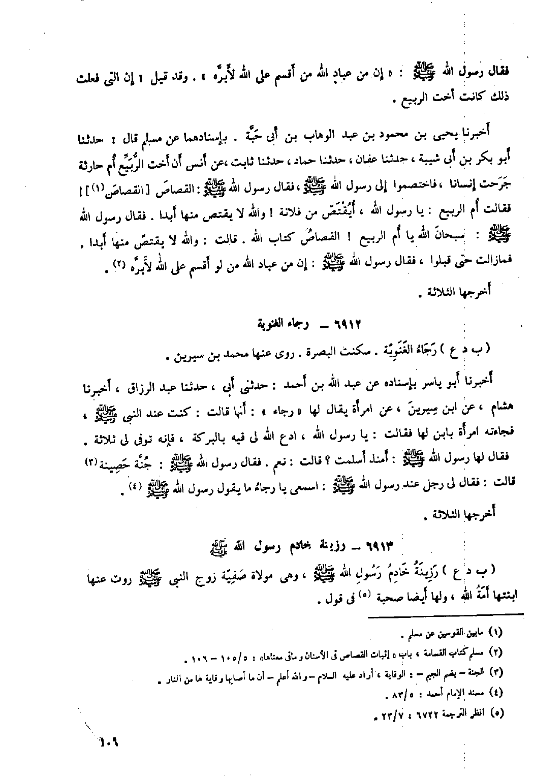 أخبرنا يحيى بن محمود بن عبد الوهاب بن أبي حبة. بإسنادهما عن مسلم قَالَ: حَدَّثَنَا أَبُو بَكْرِ بْنُ أَبِي شَيْبَةَ، حدثنا عفان، حدثنا حماد، حدثنا ثابت، عن أنس أن أخت الربيع أم حارثة جرحت إنسانا، فاختصموا إلى رسول الله صلى الله عليه وسلم، فقال رسول الله صلى الله عليه وسلم: القصاص [القصاص [١]] فقالت أم الربيع: يا رسول الله، أيقتص من فلانة! والله لا يقتص منها أبدا. فقال رسول الله صلى الله عليه وسلم: سبحان الله يا أم الربيع! القصاص كتاب الله. قالت: والله لا يقتص منها أبدا.