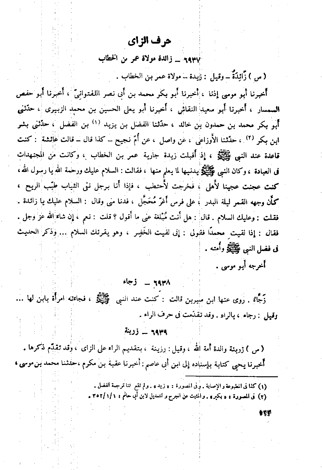 أَخْبَرَنَا أَبُو مُوسَى إِذْنًا، أَخْبَرَنَا أَبُو بَكْرٍ محمد بن أبي نصر اللفتواني، أخبرنا أبو حفص السمسار، أخبرنا أبو سعيد النقاش، أخبرنا أبو يعلى الحسين بن محمد الزبيري، حدثني أبو بكر محمد بن حمدون بن خالد، حدثنا الفضل بن يزيد [١] بن الفضل، حدّثنى بشر ابن بكر [٢] ، حدثنا الأوزاعي، عن واصل، عن أم نجيح- كذا قال- قالت عائشة: كنت قاعدة عند النَّبِيّ صَلَّى اللَّهُ عَلَيْهِ وَسَلَّمَ، إذ أقبلت زيدة جارية عمر بن الخطاب، وكانت من المجتهدات في العبادة، وكان النبي صلى الله عليه وسلم يدنيها لما يعلم منها، فقالت: السلام عليك ورحمة الله يا رسول الله، كنت عجنت عجينا لأهلي، فخرجت لأحتطب، فإذا أنا برجل نقي الثياب طيب الريح، كأن وجهه القمر ليلة البدر، على فرس أغر محجل، فدنا مني وقال: السلام عليك يا زائدة.