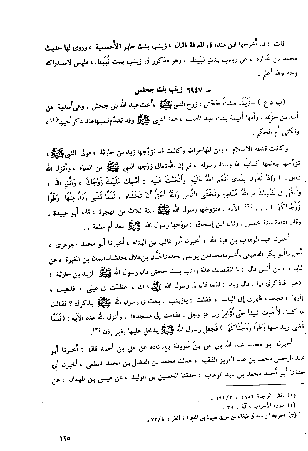 اذهب فاذكرني لها. قال زيد: فلما قال لي رسول الله صلى الله عليه وسلم ذلك، عظمت في عيني، فذهبت، إليها، فجعلت ظهري إلى الباب، فقلت: يا زينب، بعث بي رَسُول اللَّه صَلَّى اللَّهُ عَلَيْهِ وَسَلَّمَ يذكرك؟ فقالت ما كنت لأحدث شيئا حتى أؤامر ربي عز وجل. فقامت إلى مسجدها، وأنزل الله هذه الآية: (فَلَمَّا قَضى زَيْدٌ مِنْها وَطَراً زَوَّجْناكَها ٣٣: ٣٧) فَجَعَلَ رَسُولُ اللَّهِ صَلَّى اللَّهُ عَلَيْهِ وَسَلَّمَ يدخل عليها بغير إذن [٣] . أَخْبَرَنَا أَبُو مُحَمَّدٍ عَبْدُ اللَّهِ بْنُ عَلِيِّ بن سويدة بإسناده عن علي بن أحمد قال: أخبرنا أبو عبد الرحمن محمد بن عبد العزيز الفقيه، حدثنا محمد بن الفضل بن محمد السلمي، أخبرنا أبي حدثنا أبو أحمد محمد بن عبد الوهاب، حدثنا الحسين بن الوليد، عن عيسى بن طهمان، عن