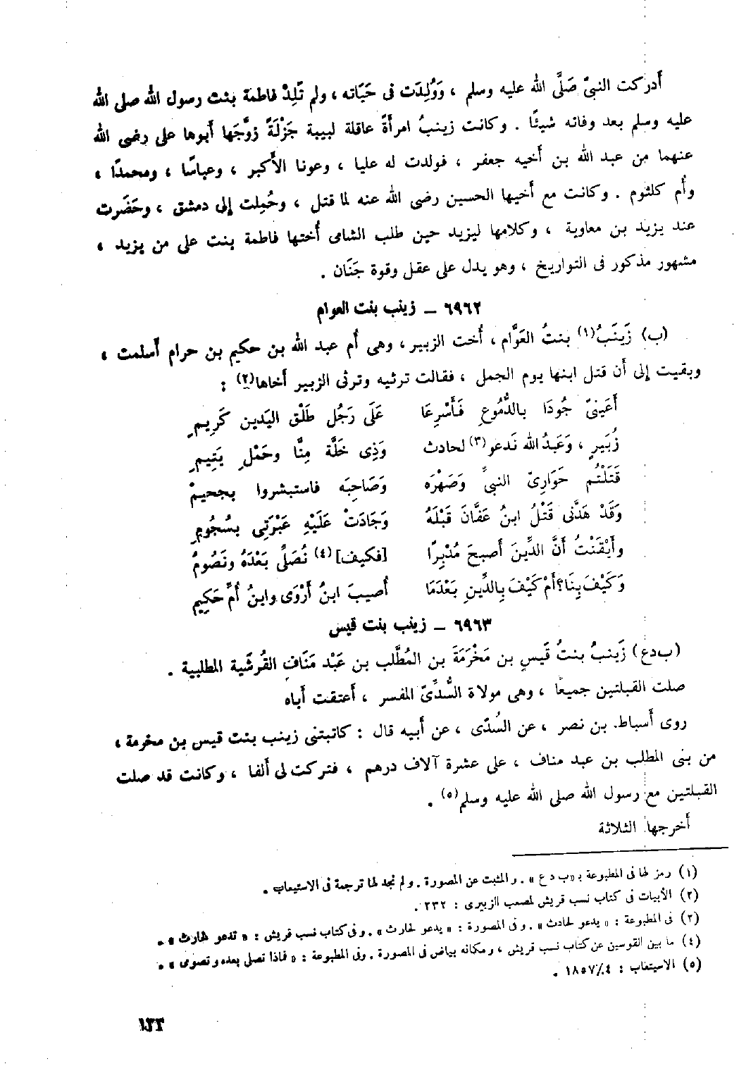 (ب) زينب [١] بنت العوام، أخت الزبير، وهي أم عبد الله بن حكيم بن حرام أسلمت، وبقيت إلى أن قتل ابنها يوم الجمل، فقالت ترثيه وترثي الزبير أخاها [٢] :