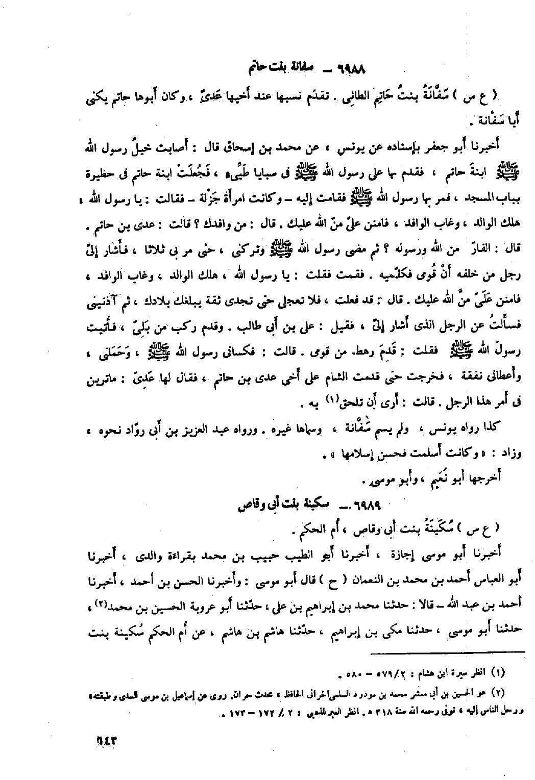 أَخْبَرَنَا أَبُو جَعْفَر بِإِسْنَادِهِ عَنْ يونس، عَنِ محمد بن إسحاق قال: أصابت خيل رسول الله صلى الله عليه وسلم ابنة حاتم، فقدم بها عَلَى رَسُول اللَّهِ صَلَّى اللَّهُ عَلَيْهِ وسلم في سبايا طيِّئ، فجعلت ابنة حاتم في حظيرة بباب المسجد، فمر بها رسول الله صلى الله عليه وسلم فقامت إليه- وكانت امرأة جزلة- فقالت: يا رسول الله، هلك الوالد، وغاب الوافد، فامنن علي من الله عليك. قال: من وافدك؟ قالت: عدي بن حاتم.