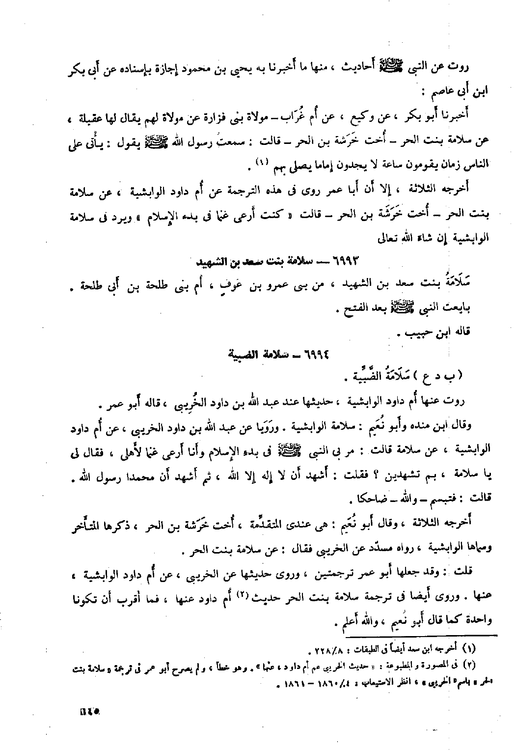 قلت: وقد جعلها أبو عمر ترجمتين، وروى حديثها عن الخريبي، عن أم داود الوابشية، عنها. وروى أيضا في ترجمة سلامة بنت الحر حديث [٢] أم داود عنها، فما أقرب أن تكونا واحدة كما قال أبو نعيم، والله أعلم.