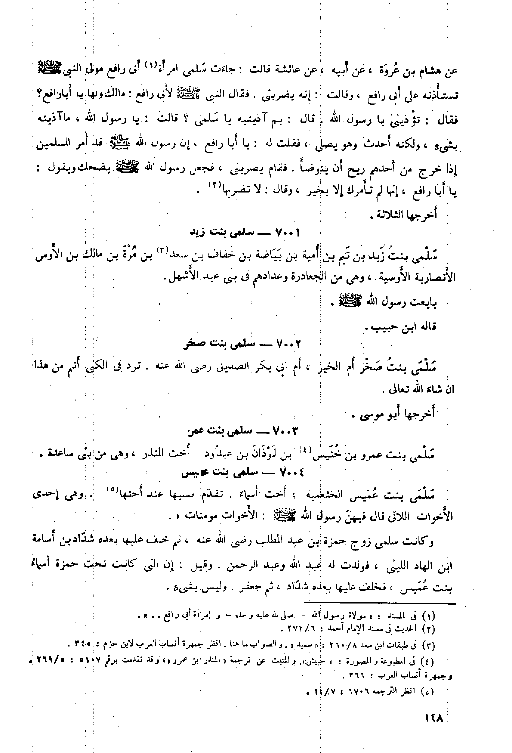 عن هشام بن عروة، عن أبيه، عن عائشة قالت: جاءت سلمى امرأة [١] أبي رافع مولى النبي صلى الله عليه وسلم تستأذنه على أبي رافع، وقالت: إنه يضربني. فَقَالَ النَّبِيّ صَلَّى اللَّهُ عَلَيْهِ وَسَلَّمَ لأبي رافع: مالك ولها يا أبا رافع؟
