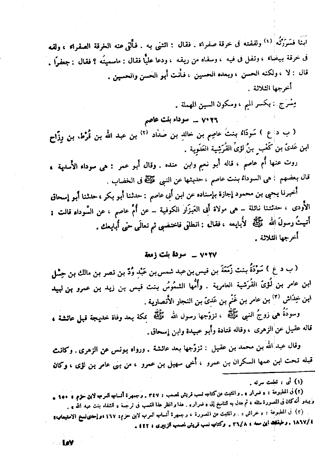 (ب د ع) سودة بنت زمعة بْن قيس بْن عَبْد شمس بْن عبد ود بْن نصر بن مالك بن حسل ابن عامر بن لؤي القرشية العامرية. وأمها الشموس بنت قيس بن زيد بن عمرو بن لبيد ابن خداش [٣] بْن عامر بْن غنم بْن عدي بن النجار الأنصارية.