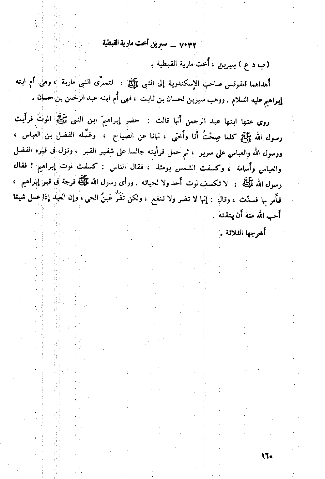 روى عنها ابنها عبد الرحمن أنها قالت: حضر إبراهيم ابن النبي صلى الله عليه وسلم الموت فرأيت رَسُول اللَّهِ صَلَّى اللَّهُ عَلَيْهِ وَسَلَّمَ كلما صحت أنا وأختي، نهانا عن الصياح، وغسله الفضل بن العباس، ورسول الله والعباس على سرير، ثم حمل فرأيته جالسا على شفير القبر، ونزل في قبره الفضل والعباس وأسامة، وكسفت الشمس يومئذ، فقال الناس: كسفت لموت إبراهيم! فقال رسول الله صلى الله عليه وسلم: لا تكسف لموت أحد ولا لحياته. ورأى رَسُول اللَّهِ صَلَّى اللَّهُ عَلَيْهِ وَسَلَّمَ فرجة في قبر إبراهيم، فأمر بها فسدت، وقال: إنها لا تضر ولا تنفع، ولكن تقر عين الحي، وإن العبد إذا عمل شيئا أحب الله منه أن يتقنه. أخرجها الثلاثة