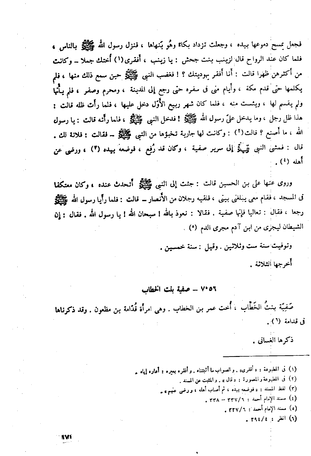وروى عنها علي بن الحسين قالت: جئت إلى النبي صلى الله عليه وسلم أتحدث عنده، وكان معتكفا في المسجد، فقام معي يبلغني بيتي، فلقيه رجلان من الأنصار- قالت: فلما رأيا رسول الله صلّى الله عليه وسلم رجعا، فقال: تعاليا فإنها صفية. فقالا: نعوذ باللَّه! سبحان الله! يا رسول الله. فقال: إن الشيطان ليجري من ابن آدم مجرى الدم [٥] . وتوفيت سنة ست وثلاثين. وقيل: سنة خمسين.