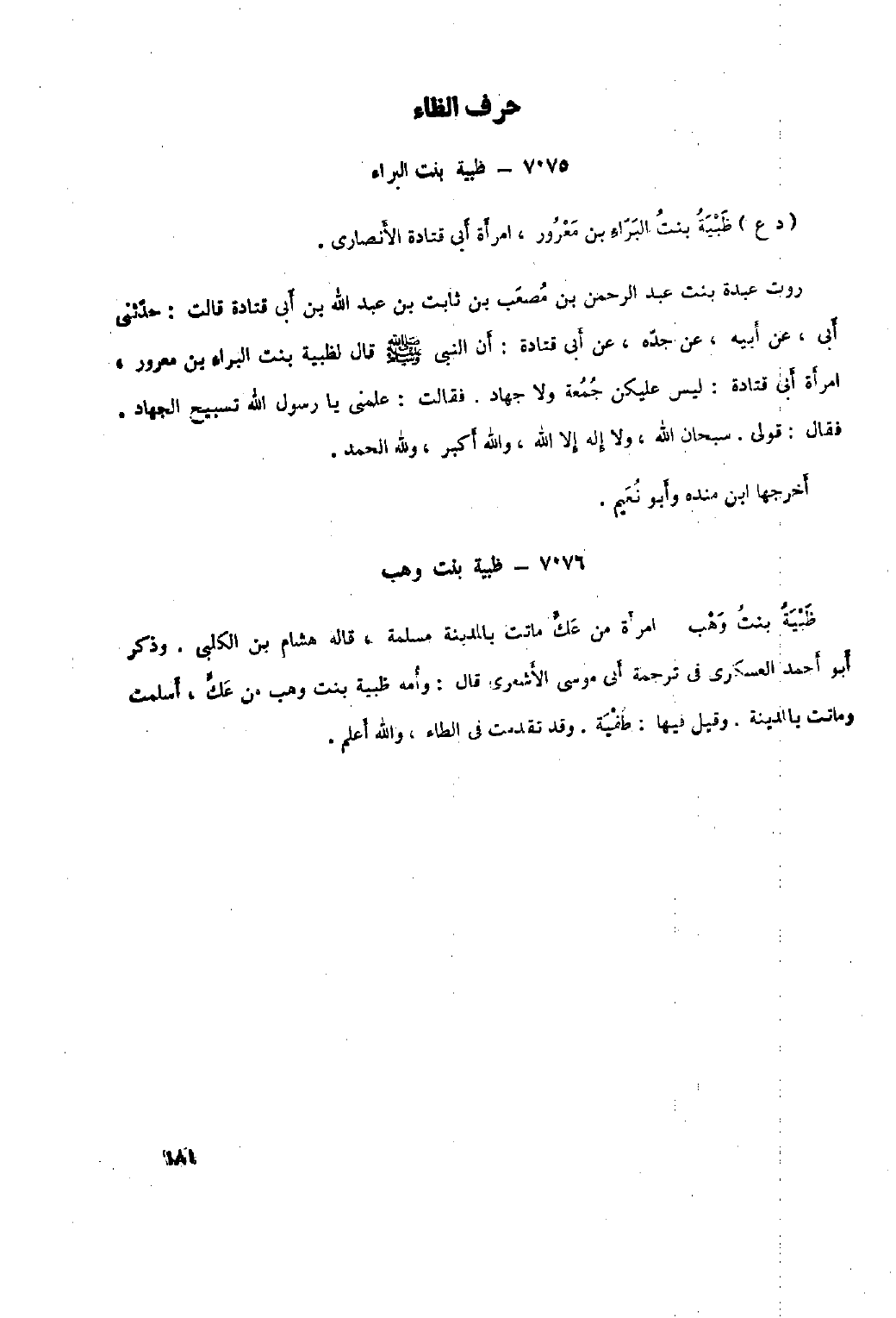 روت عبدة بنت عبد الرحمن بْنُ مُصْعَبِ بْنِ ثَابِتِ بْنِ عَبْدِ اللَّهِ بن أبي قتادة قالت: حدثني أَبِي، عَنْ أبيه، عَنْ جده، عَنْ أبي قتادة: أن النبي صلى الله عليه وسلم قال لظبية بنت البراء بن معرور، امرأة أبي قتادة: ليس عليكن جمعة ولا جهاد. فقالت: علمني يا رسول الله تسبيح الجهاد.