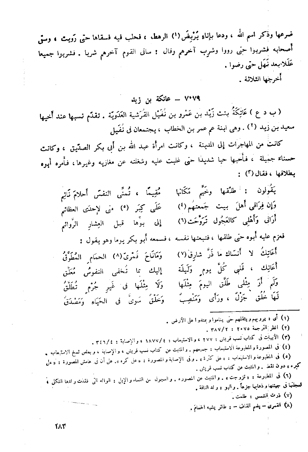 (ب د ع) عاتكة بِنْت زَيْد بْن عَمْرو بْن نفيل القرشية العدوية. تقدم نسبها عند أخيها سعيد بن زيد [٢] . وهي ابنة عم عمر بْن الخطاب، يجتمعان في نفيل كانت من المهاجرات إلى المدينة، وكانت امرأة عبد الله بن أبي بكر الصديق، وكانت حسناء جميلة، فأحبها حبا شديدا حتى غلبت عليه وشغلته عن مغازيه وغيرها، فأمره أبوه بطلاقها، فقال [٣] :