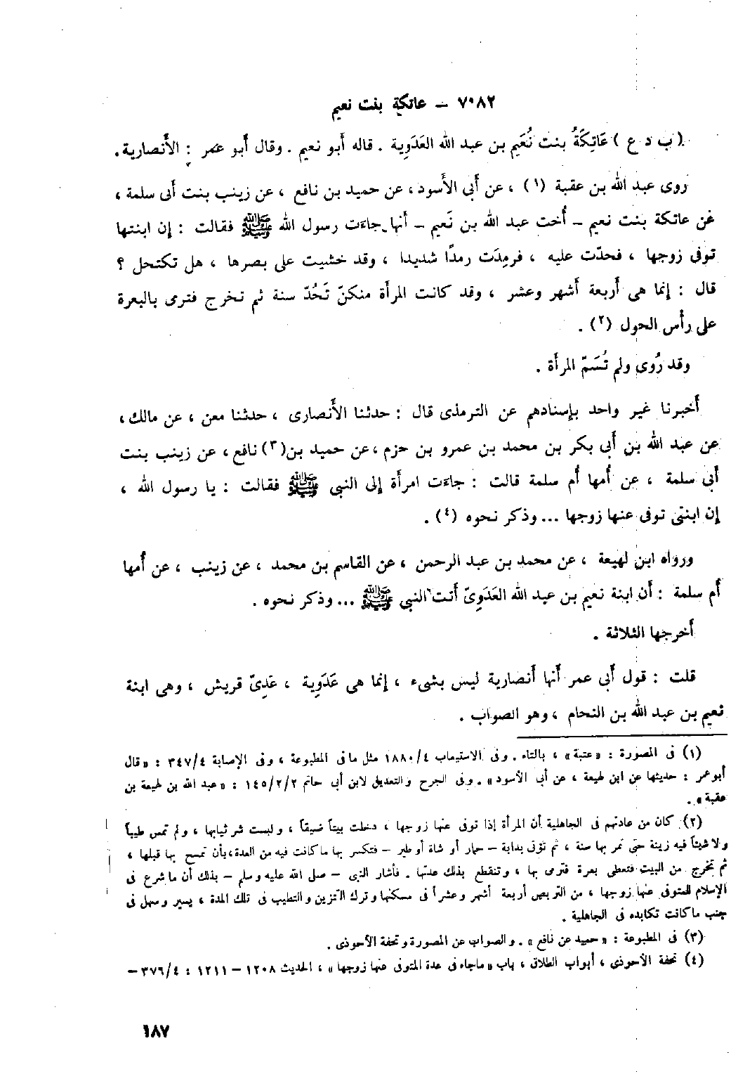 قلت: قول أبي عمر أنها أنصارية ليس بشيء، إنما هي عدوية، عدي قريش، وهي ابنة نعيم بن عبد الله بن النحام، وهو الصواب.