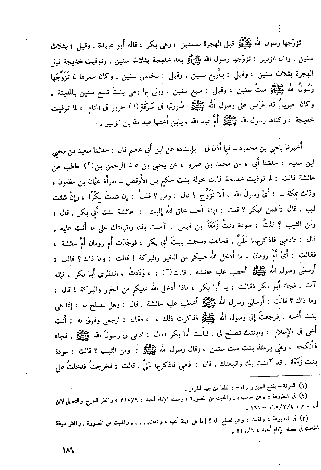 أخبرنا يحيى بن محمود- فيما أذن لي- بِإِسْنَادِهِ عَنِ ابْنِ أَبِي عَاصِمٍ قَالَ: حَدَّثَنَا سعيد بن يحيى ابن سَعِيد، حَدَّثَنَا أبي، عن مُحَمَّد بْن عَمْرو، عَنْ يَحْيَى بْنِ عَبْدِ الرَّحْمَنِ بْنِ [٢] حَاطِبٍ عن عائشة قالت: لما توفيت خديجة قالت خولة بنت حكيم بن الأوقص- امرأة عثمان بن مظعون، وذلك بمكة-: أي رسول الله، ألا تزوج؟ قال: ومن؟ قلت: إن شئت بكرا، وإن شئت ثيبا. قال: فمن البكر؟ قلت: ابنة أحب خلق الله إليك: عائشة بنت أبى بكر. قال: