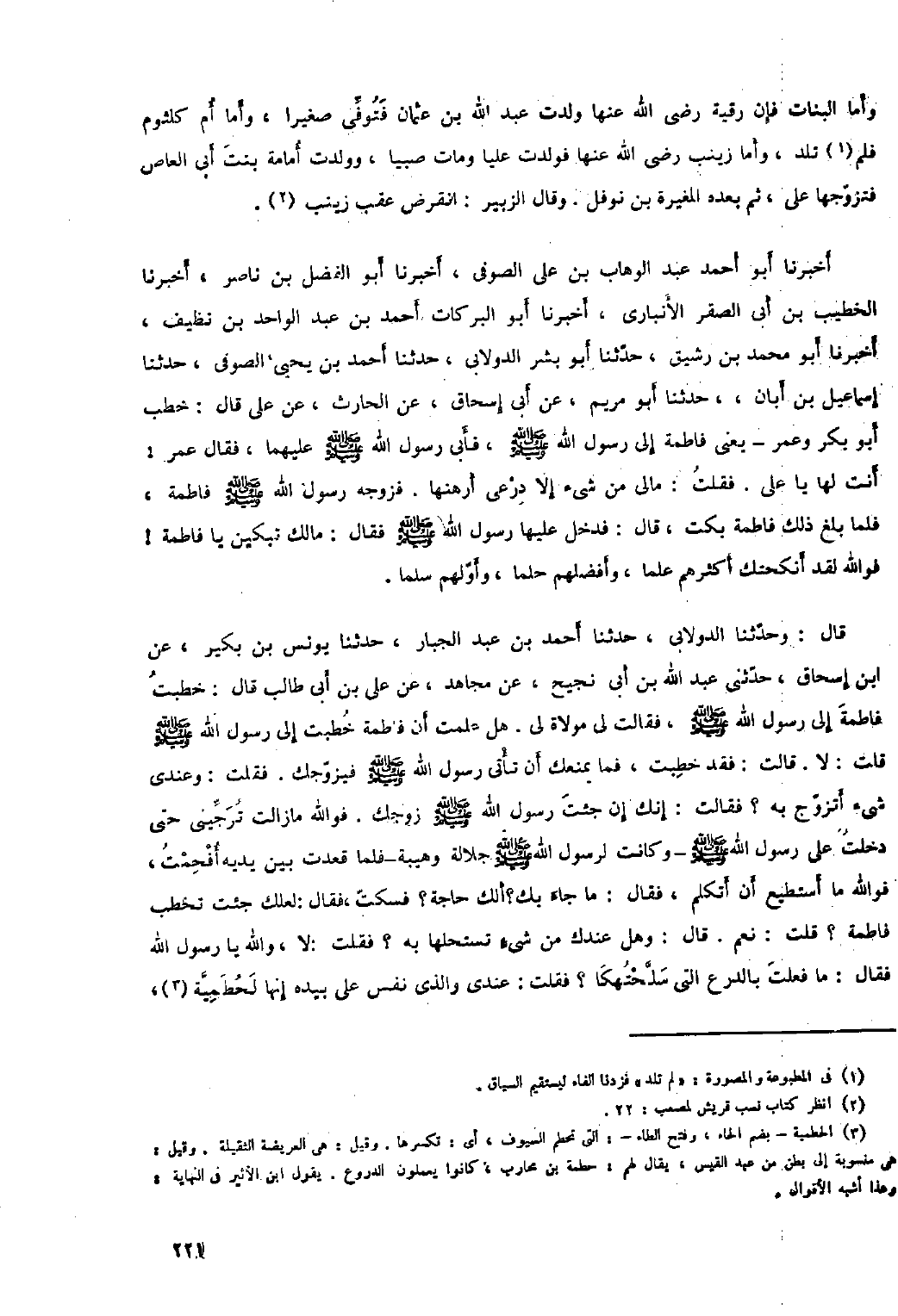 أخبرنا أبو أحمد عبد الوهاب بن علي الصوفي، أخبرنا أبو الفضل بن ناصر، أخبرنا الخطيب بن أبي الصقر الأنباري، أخبرنا أبو البركات أحمد بن عبد الواحد بن نظيف، أخبرنا أبو محمد بن رشيق، حدثنا أبو بشر الدولابي، حدثنا أحمد بن يحيى الصوفي، حدثنا إسماعيل بن أبان،، حدثنا أبو مريم، عَنْ أَبِي إِسْحَاقَ، عَنِ الْحَارِثِ، عَنْ عَلِيٍّ قال: خطب أبو بكر وعمر- يعني فاطمة إلى رسول الله صلى الله عليه وسلم، فأبى رَسُول اللَّهِ صَلَّى اللَّهُ عَلَيْهِ وَسَلَّمَ عليهما، فقال عمر: