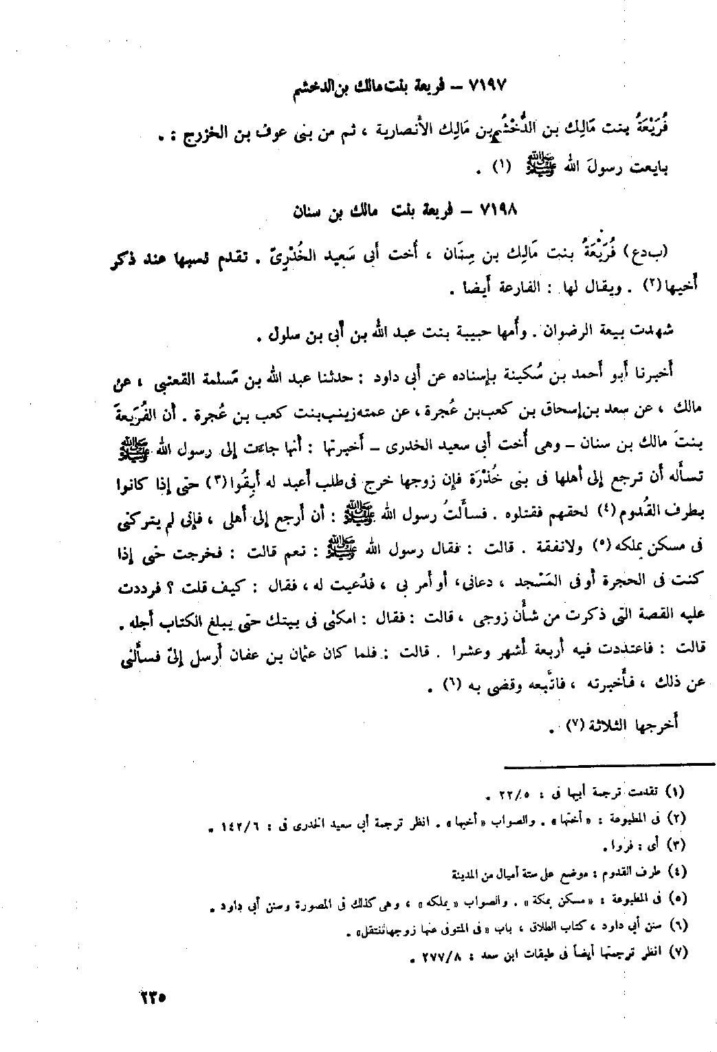 أخبرنا أبو أحمد بن سكينة بإسناده عن أبي داود: حدثنا عبد الله بن مسلمة القعنبي، عن مالك، عَنْ سعد بْن إِسْحَاق بْن كعب بْن عجرة، عن عمته زينب بنت كعب بن عجرة. أن الفريعة بنت مالك بن سنان- وهي أخت أبي سعيد الخدري- أخبرتها: أنها جاءت إلى رسول الله صلى الله عليه وسلم تسأله أن ترجع إلى أهلها في بني خذرة فإن زوجها خرج في طلب أعبد له ابقوا [٣] حتى إذا كانوا بطرف القدوم [٤] لحقهم فقتلوه. فسألت رسول الله صلى الله عليه وسلم: أن أرجع إلى أهلي، فإني لم يتركني في مسكن يملكه [٥] ولا نفقة. قالت: فقال رسول الله صلى الله عليه وسلم: نعم قالت: فخرجت حتى إذا كنت في الحجرة أوفى المسجد، دعاني، أو أمر بي، فدعيت له، فقال: كيف قلت؟ فرددت عليه القصة التي ذكرت من شأن زوجي، قالت: فقال: امكثي في بيتك حتى يبلغ الكتاب أجله.