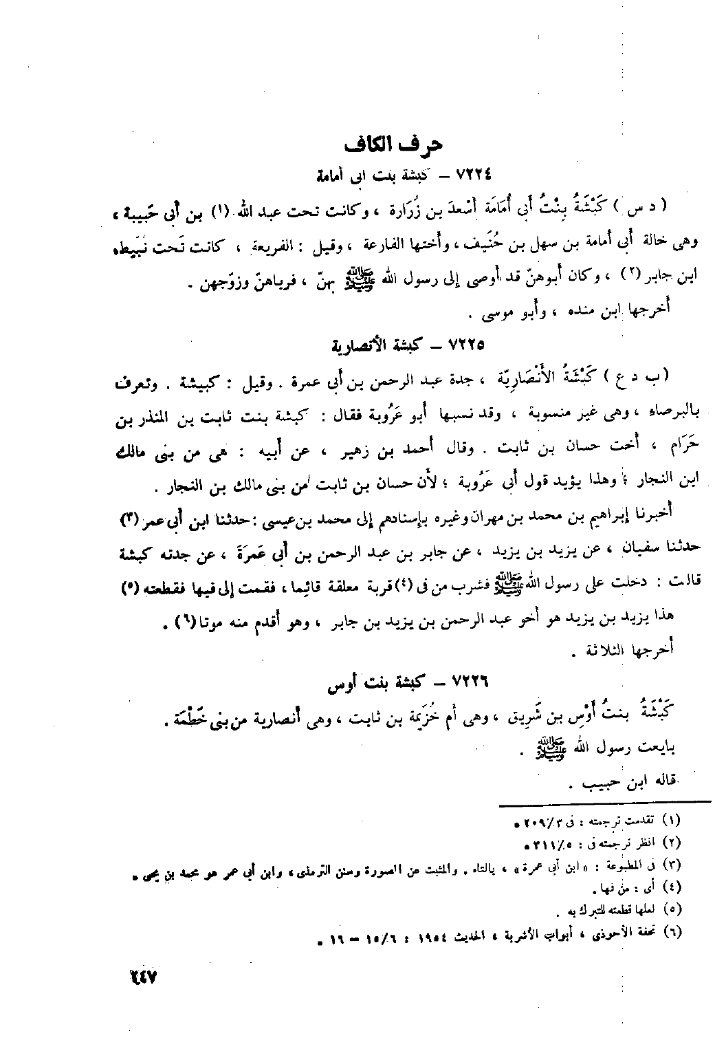 (د س) كبشة بنت أبي أمامة أسعد بن زرارة، وكانت تحت عبد الله [١] بن أبي حبيبة، وهي خالة أبي أمامة بن سهل بن حنيف، وأختها الفارعة، وقيل: الفريعة، كانت تحت نبيط ابن جابر [٢] ، وكان أبوهن قد أوصى إلي رَسُول اللَّهِ صَلَّى اللَّهُ عَلَيْهِ وسلم بهن، فرباهن وزوّجهن.
