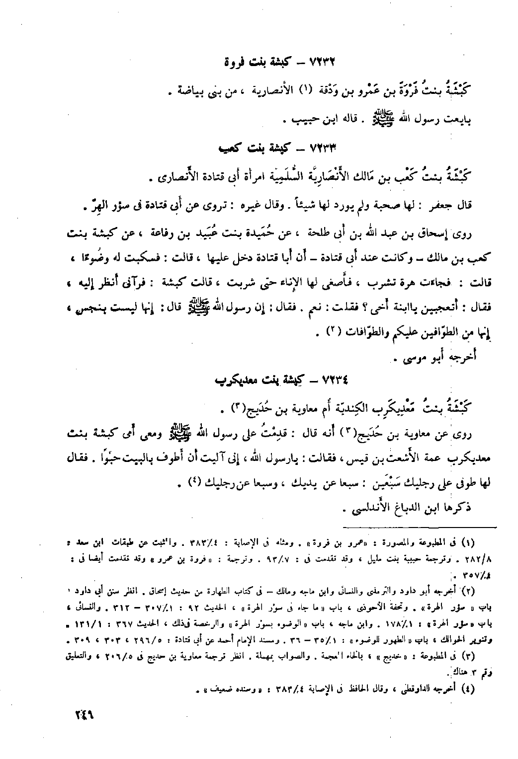روى إِسْحَاق بْن عَبْد اللَّهِ بْن أَبِي طَلْحَةَ، عن حميدة بنت عبيد بن رفاعة، عن كبشة بنت كعب بن مالك- وكانت عند أبي قتادة- أن أبا قتادة دخل عليها، قالت: فسكبت له وضوءا، قالت: فجاءت هرة تشرب، فأصغى لها الإناء حتى شربت، قالت كبشة: فرآني أنظر إليه، فقال: أتعجبين يا ابنة أخى؟ فقلت: نعم. فقال: أن رسول الله صلى الله عليه وسلم قال: إنها ليست بنجس، إنها من الطوافين عليكم والطوافات [٢] . أخرجه أبو موسى.