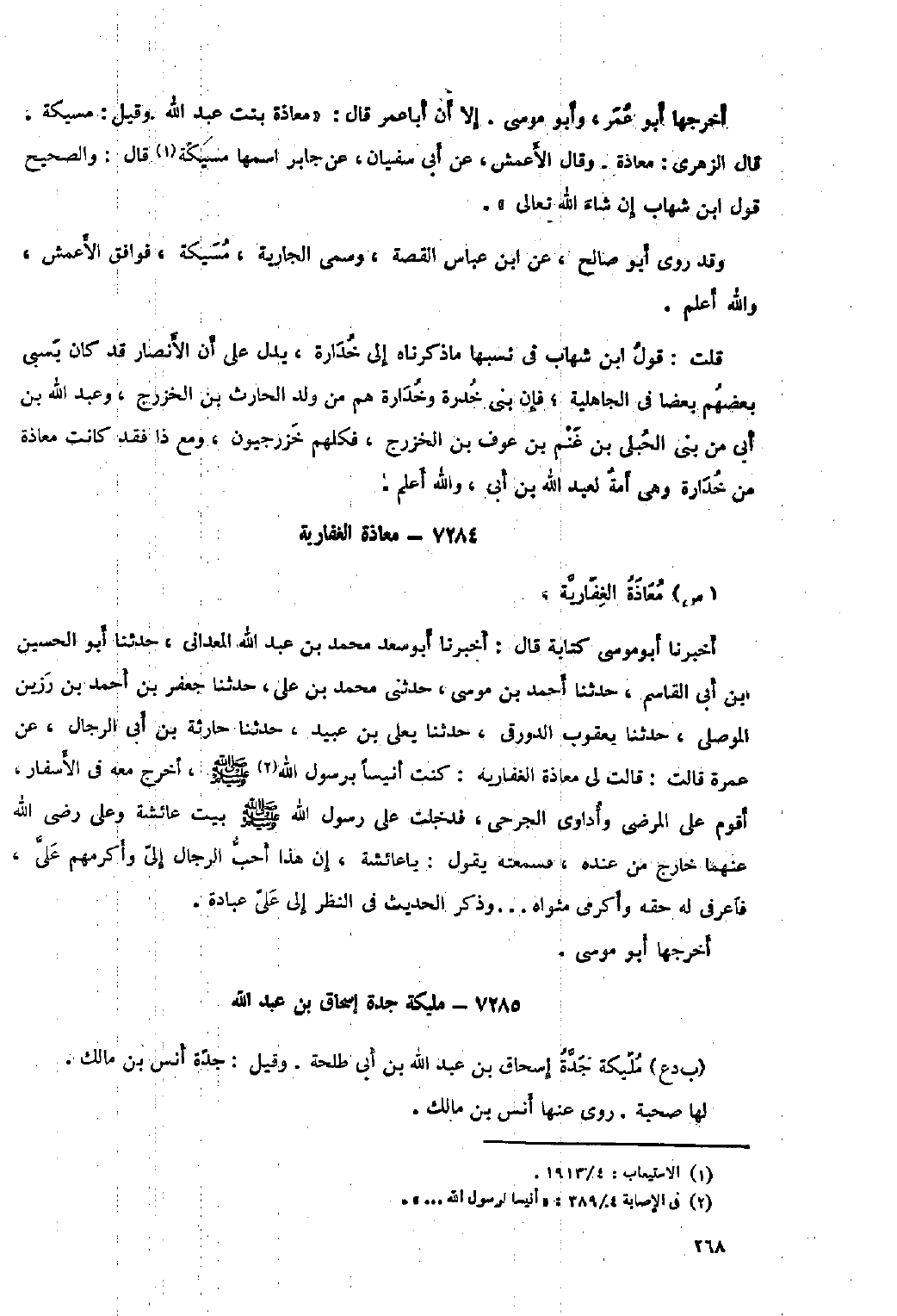 أخرجها أَبُو عمر، وَأَبُو موسى. إلا أن أبا عمر قال: «معاذة بنت عبد الله. وقيل: مسيكة.