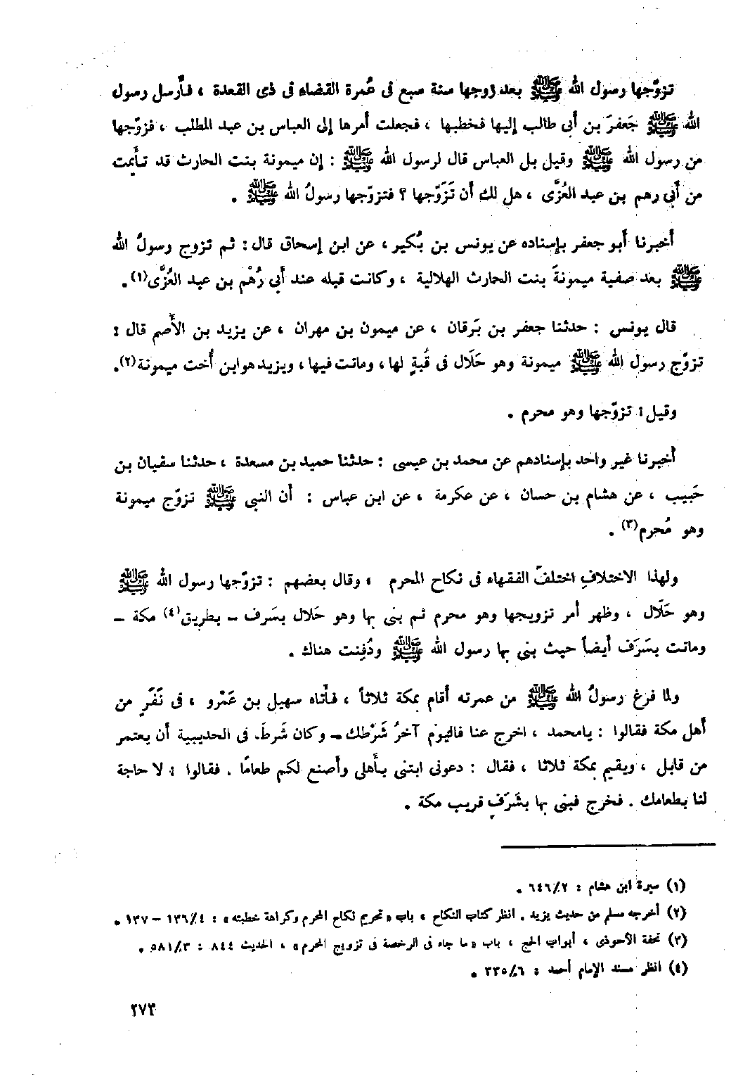 ولهذا الاختلاف اختلف الفقهاء في نكاح المحرم، وقال بعضهم: تزوجها رَسُول اللَّهِ صَلَّى اللَّهُ عَلَيْهِ وَسَلَّمَ وهو حلال، وظهر أمر تزويجها وهو محرم ثم بنى بها وهو حلال بسرف- بطريق [٤] مكة- وماتت بسرف أيضا حيث بنى بها رسول الله صلى الله عليه وسلم ودفنت هناك.