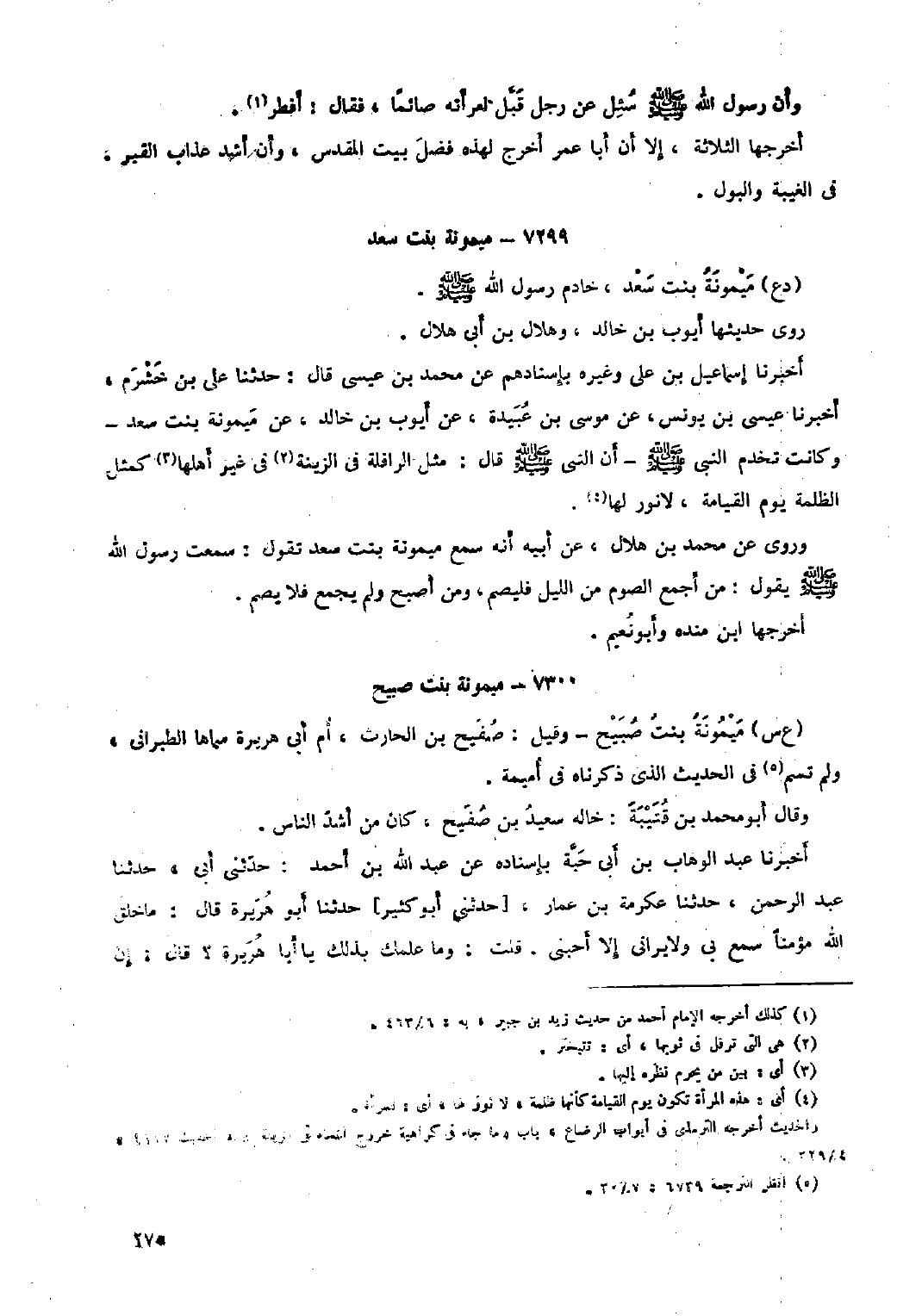 أخبرنا إِسْمَاعِيلُ بْنُ عَلِيٍّ وَغَيْرُهُ بِإِسْنَادِهِمْ عَنْ مُحَمَّدِ بْنِ عِيسَى قَالَ: حَدَّثَنَا عَلِيُّ بْنُ خشرم، أخبرنا عيسى بن يونس، عن موسى بن عبيدة، عن أيوب بن خالد، عن ميمونة بنت سعد- وكانت تخدم النَّبِيّ صَلَّى اللَّهُ عَلَيْهِ وَسَلَّمَ- أن النَّبِيّ صلى الله عليه وسلم قال: مثل الرافلة في الزينة [٢] في غير أهلها [٣] كمثل الظلمة يوم القيامة، لا نور لها [٤] . وروى عن محمد بن هلال، عن أبيه أنه سمع ميمونة بنت سعد تقول: سمعت رسول الله صلى الله عليه وسلم يقول: من أجمع الصوم من الليل فليصم، ومن أصبح ولم يجمع فلا يصم. أخرجها ابن مندة وأبو نعيم.