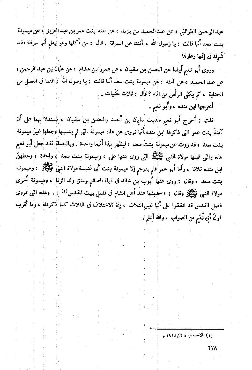 قلت: أخرج أبو نعيم حديث سليمان بن أحمد والحسن بن سفيان، مستدلا بهما على أن آمنة بنت عمر التي ذكرها ابن منده أنها تروي عن هذه ميمونة التي لم ينسبها وجعلها غير ميمونة بنت سعد، قد روت عن ميمونة بنت سعد، ليظهر بهذا أنهما واحدة. وبالجملة فقد جعل أبو نعيم هذه والتي قبلها مولاة النبي صلى الله عليه وسلم التي روى عنها علي، وميمونة بنت سعد، واحدة، وجعلهن ابن منده ثلاثا، وأما أبو عمر فلم يترجم إلا ميمونة بنت أبي عنبسة مولاة النبي صلى الله عليه وسلم، وميمونة بنت سعد، وقال: روى عنها أيوب بن خالد في قبلة الصائم وعتق ولد الزنا، وميمونة أخرى مولاة النبي صلى الله عليه وسلم وقال: «حديثها عند أهل الشام في فضل بيت المقدس [١] » . وهذه التي تروي فضل القدس قد اتفقوا على أنها غير الثلاث، إنما الاختلاف في الثلاث كما ذكرناه، وما أقرب قول أبي نعيم من الصواب، والله أعلم.