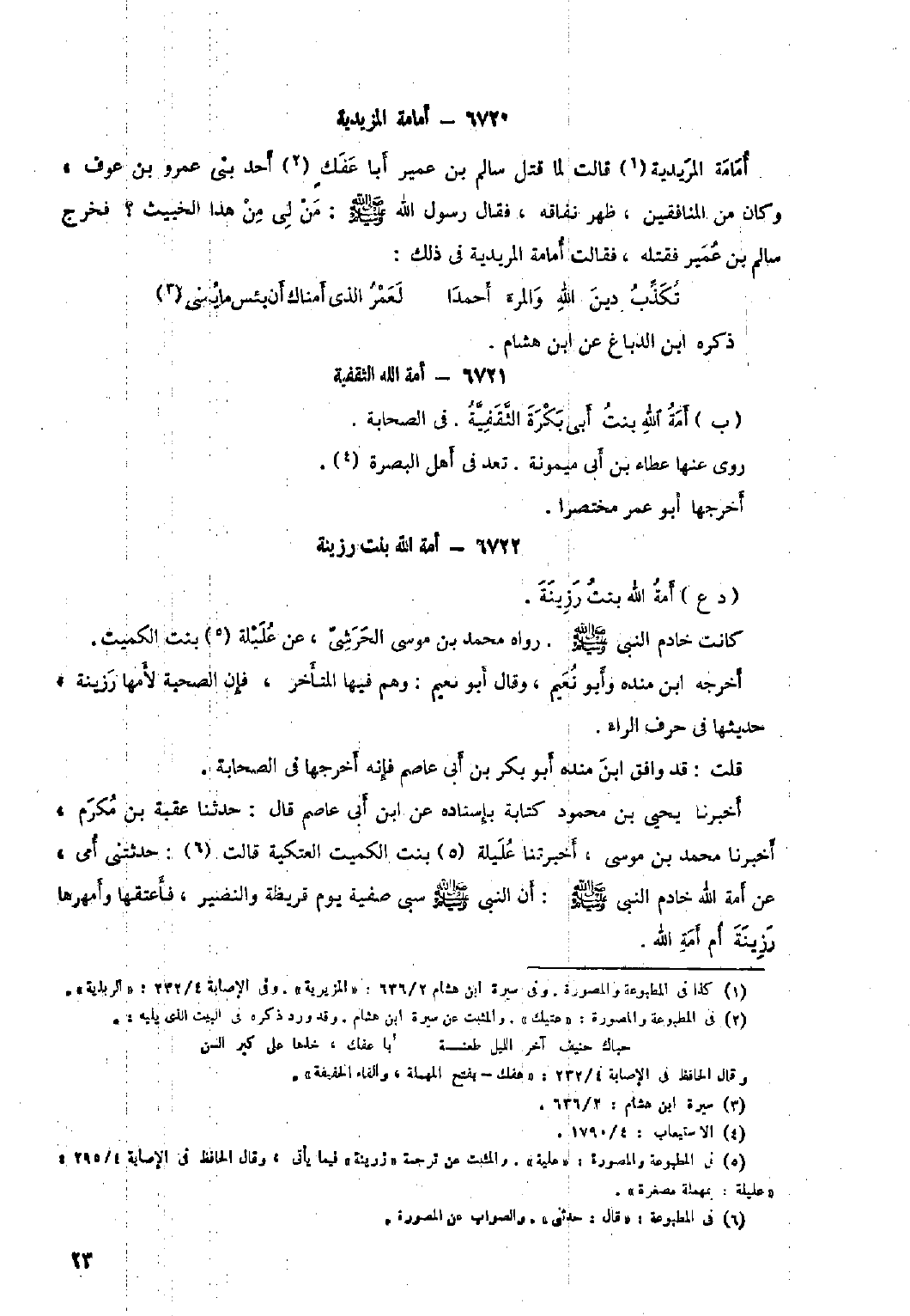 امرأة اسمها بركة فشربته فطلبه فلم يجده فقيل شربته بركة فقال: «لقد احتظرت من النار بحظار» أخرجه الثلاثة إلا أن ابن مندة أخرج حديث شرب البول فِي هَذِهِ الترجمة وأخرجه أَبُو نعيم فِي ترجمة أميمة بنت أبي صيفي بعد هذه الترجمة.
