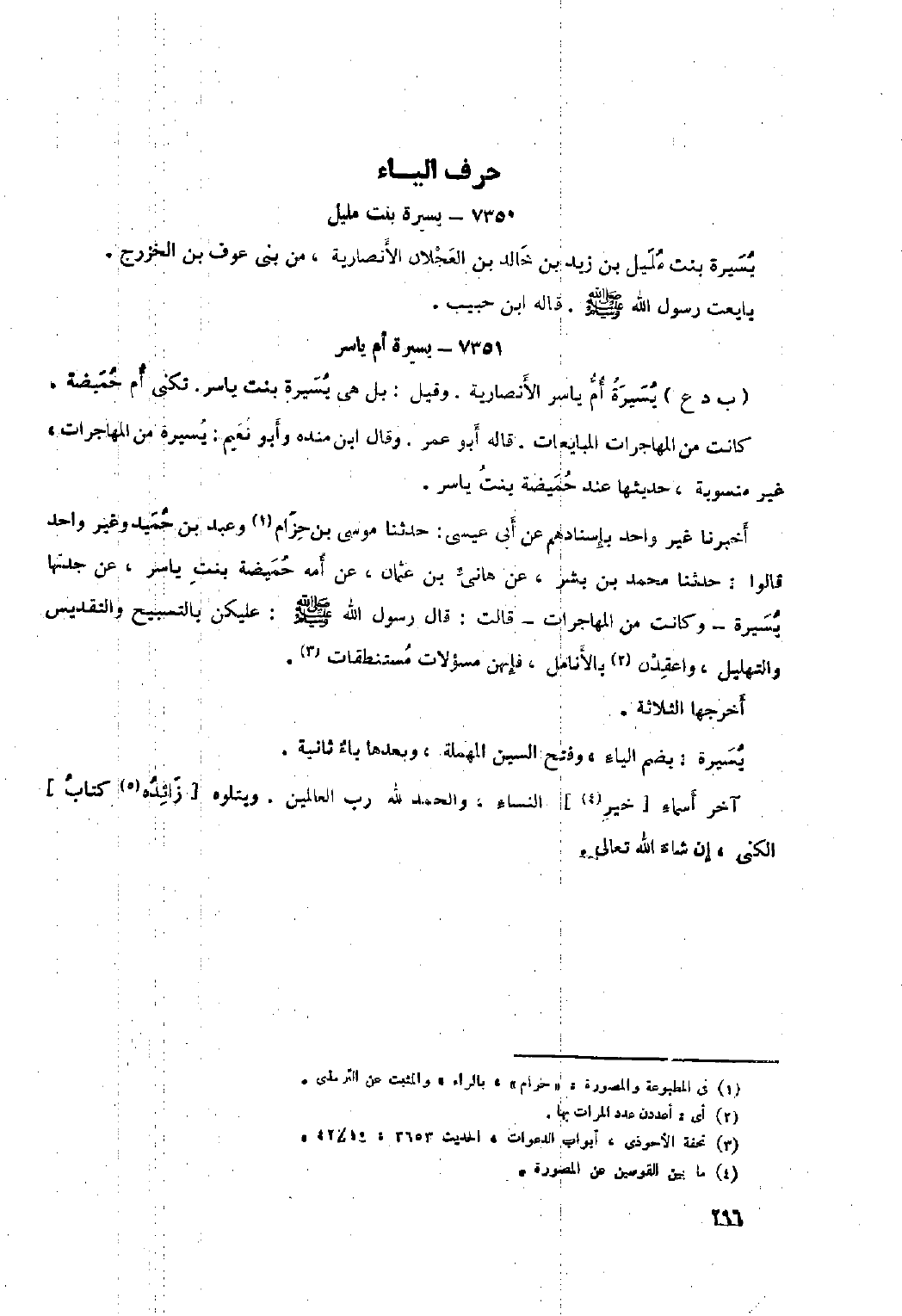 أَخْبَرَنَا غير واحد بإسنادهم عَنْ أَبِي عِيسَى: حدثنا موسى بن حزام [١] وعبد بن حميد وغير واحد قالوا: حدثنا محمد بن بشر، عن هانئ بن عثمان، عن أمه حميضة بنت ياسر، عن جدتها يسيرة- وكانت من المهاجرات- قَالَتْ: قَالَ رَسُولُ اللَّهِ صَلَّى اللَّهُ عَلَيْهِ وسلم: عليكن بالتسبيح والتقديس والتهليل، واعقدن [٢] بالأنامل، فإنهن مسئولات مستنطقات [٣] . أخرجها الثلاثة.