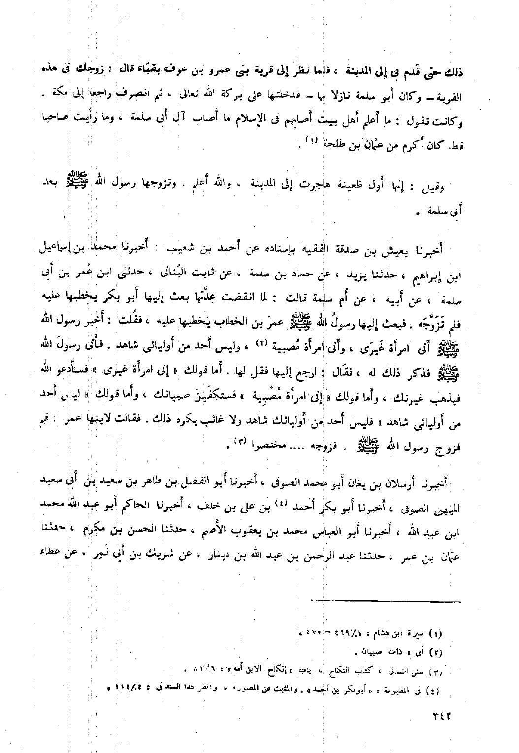 أخبرنا يعيش بن صدقة الفقيه بإسناده عن أحمد بن شعيب: أخبرنا محمد بن إسماعيل ابن إبراهيم، حدثنا يزيد، عن حماد بن سلمة، عن ثابت البناني، حَدَّثَنِي ابن عمر بن أبي سلمة، عن أبيه، عن أم سلمة قالت: لما انقضت عدتها بعث إليها أبو بكر يخطبها عليه فلم تزوجه. فبعث إليها رسول الله صلى الله عليه وسلم عمر بن الخطاب يخطبها عليه، فقلت: أُخْبِرَ رَسُولُ اللَّهِ صَلَّى اللَّهُ عَلَيْهِ وَسَلَّمَ أني امرأة غيرى، وأني امرأة مصبية [٢] ، وليس أحد من أوليائي شاهد. فأتى رسول الله صلى الله عليه وسلم فذكر ذلك له، فقال: ارجع إليها فقل لها. أما قولك «إني امرأة غيرى» فسأدعو الله فيذهب غيرتك، وأما قولك «إني امرأة مصبية» فستكفين صبيانك، وأما قولك «ليس أحد من أوليائي شاهد» فليس أحد من أوليائك شاهد ولا غائب يكره ذلك. فقالت لابنها عمر: قم فزوج رسول الله صلى الله عليه وسلم. فزوجه ... مختصرا [٣] .