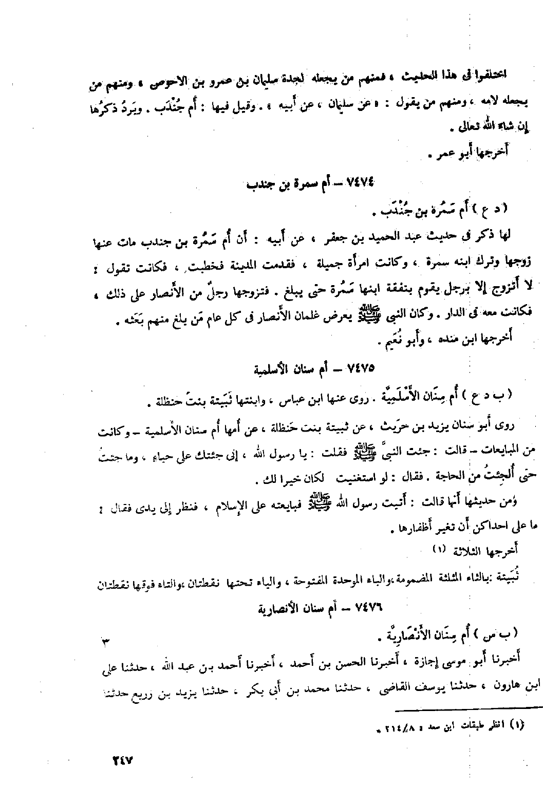روى أبو سنان يزيد بن حريث، عن ثبيتة بنت حنظلة، عن أمها أم سنان الأسلمية- وكانت من المبايعات- قالت: جئت النَّبِيَّ صَلَّى اللَّهُ عَلَيْهِ وَسَلَّمَ فَقُلْتُ: يَا رسول الله، إني جئتك على حياء، وما جئت حتى ألجأت من الحاجة. فقال: لو استغنيت لكان خيرا لك. ومن حديثها أنها قالت: أتيت رسول الله صلى الله عليه وسلم فبايعته على الإسلام، فنظر إلى يدي فقال: