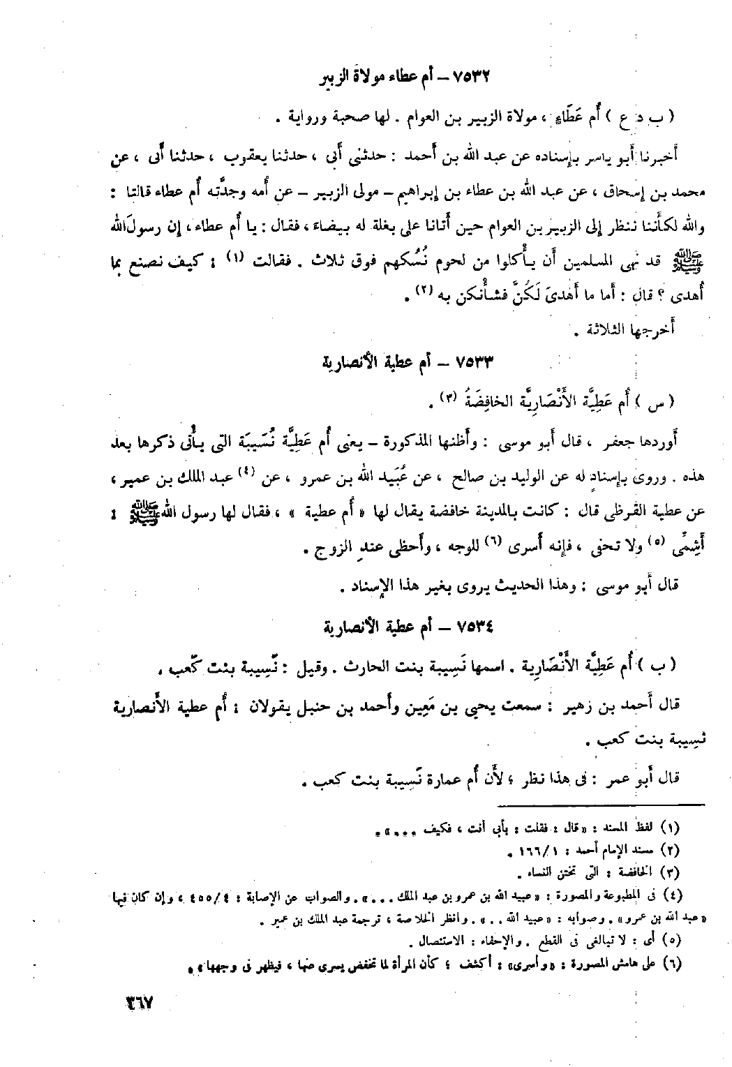 (ب) أم عطية الأنصارية. اسمها نسيبة بنت الحارث. وقيل: نسيبة بنت كعب، قال أحمد بن زهير: سمعت يحيى بن معين وأحمد بن حنبل يقولان: أم عطية الأنصارية نسيبة بنت كعب.